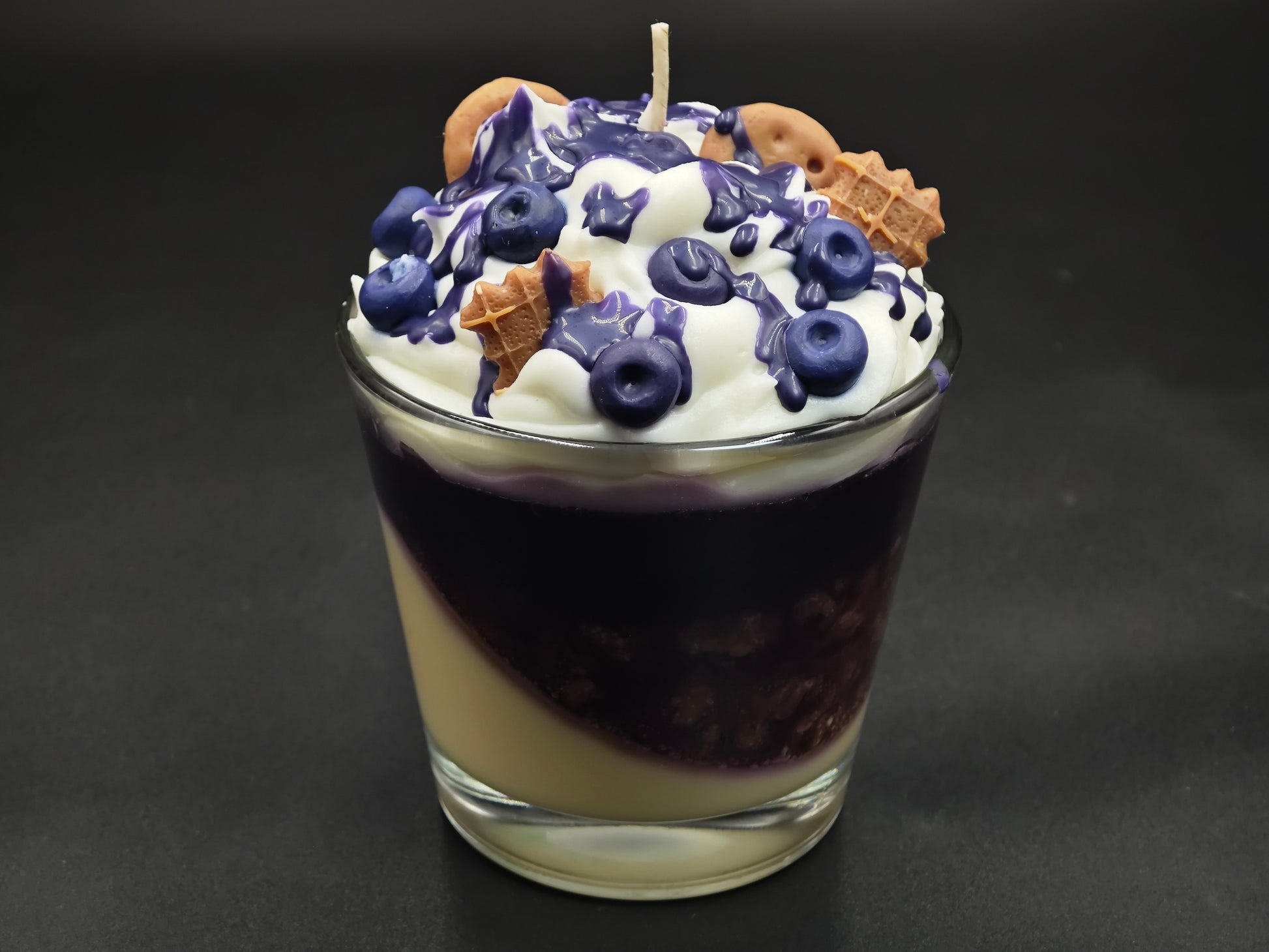 A Blueberry Bliss egy látványos, desszert ihlette pohárgyertya, amely a friss áfonya, a krémes sütemények és az édes aromák világát hozza el otthonodba. A gyertya alsó vaníliás rétegét mély, sötét áfonyaszín követi, a tetején pedig gazdag, habos viaszkrém ül. A díszítés részeként aprólékosan megformált áfonyaszemek és ropogós hatású gofridarabok kerültek rá – mintha egy valódi, frissen készült áfonyás desszert lenne.