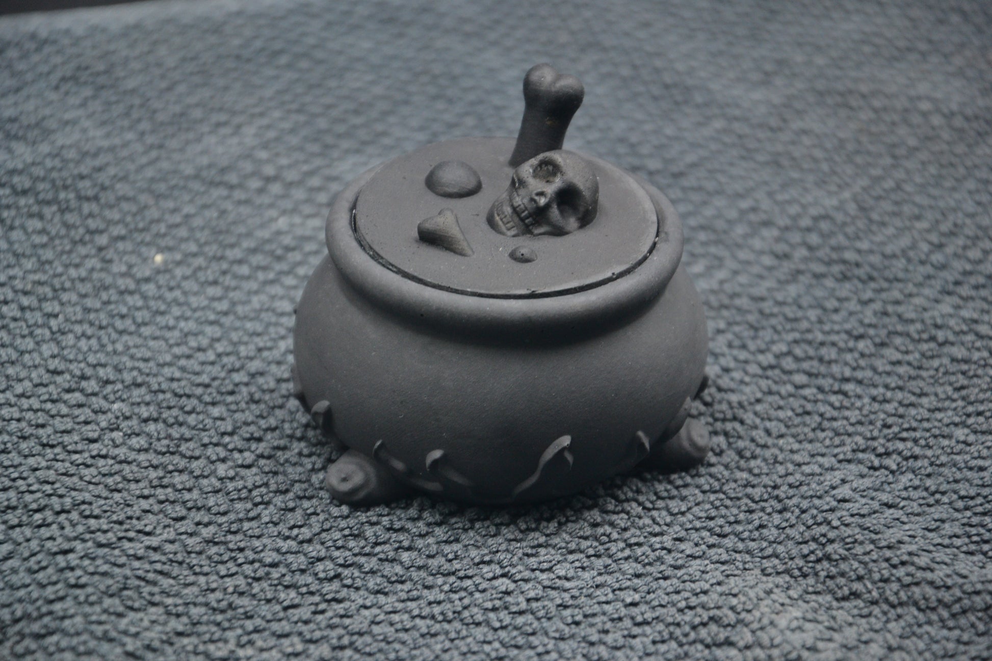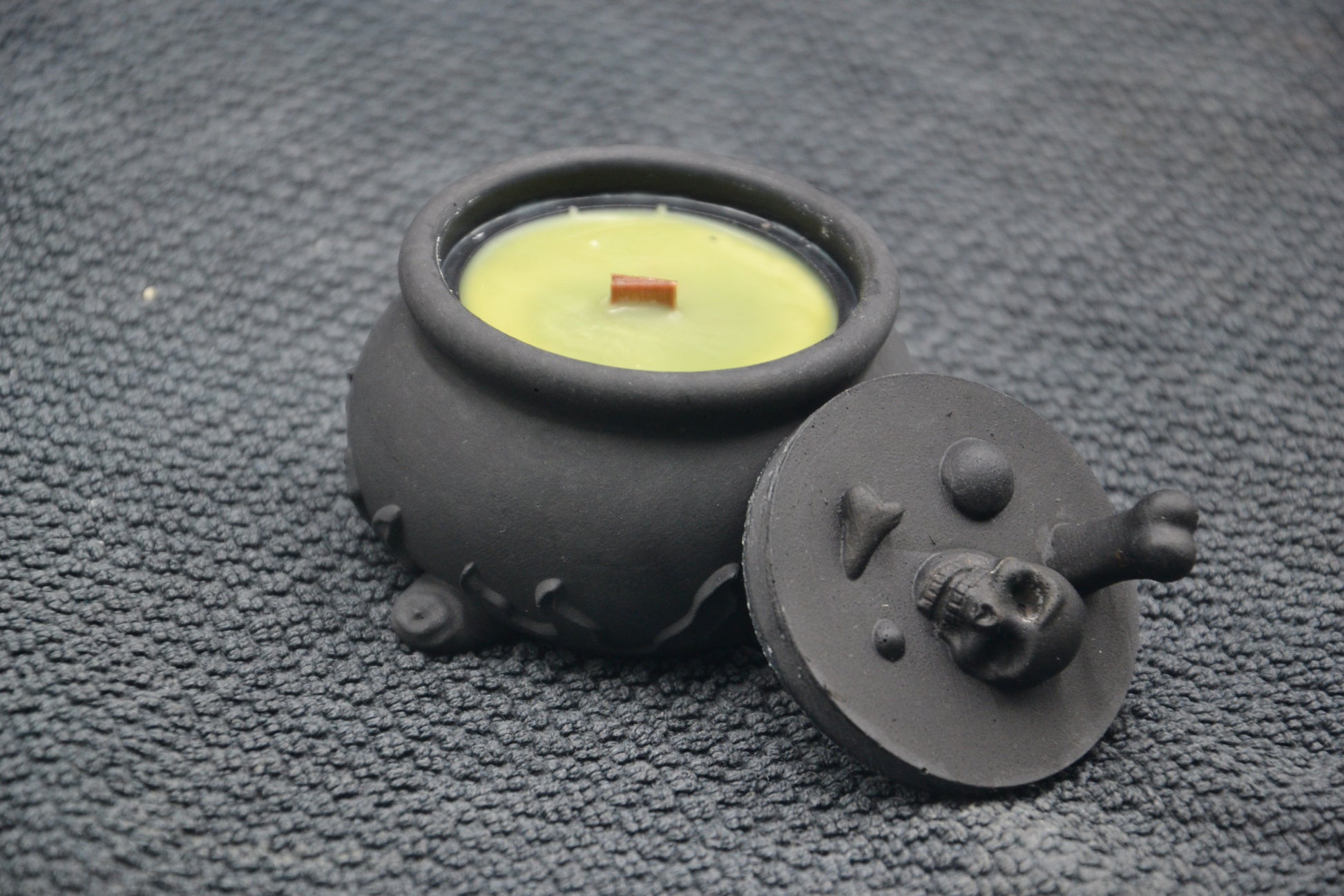 Egyedi, kézzel készült boszorkányüst alakú gyertya, mely szójaviaszból készült és ásványgyanta üstbe öntöttük. A fedelén apró koponya és bájitalkeverő motívum díszíti, tökéletes kiegészítője a mágikus hangulatú otthonoknak.