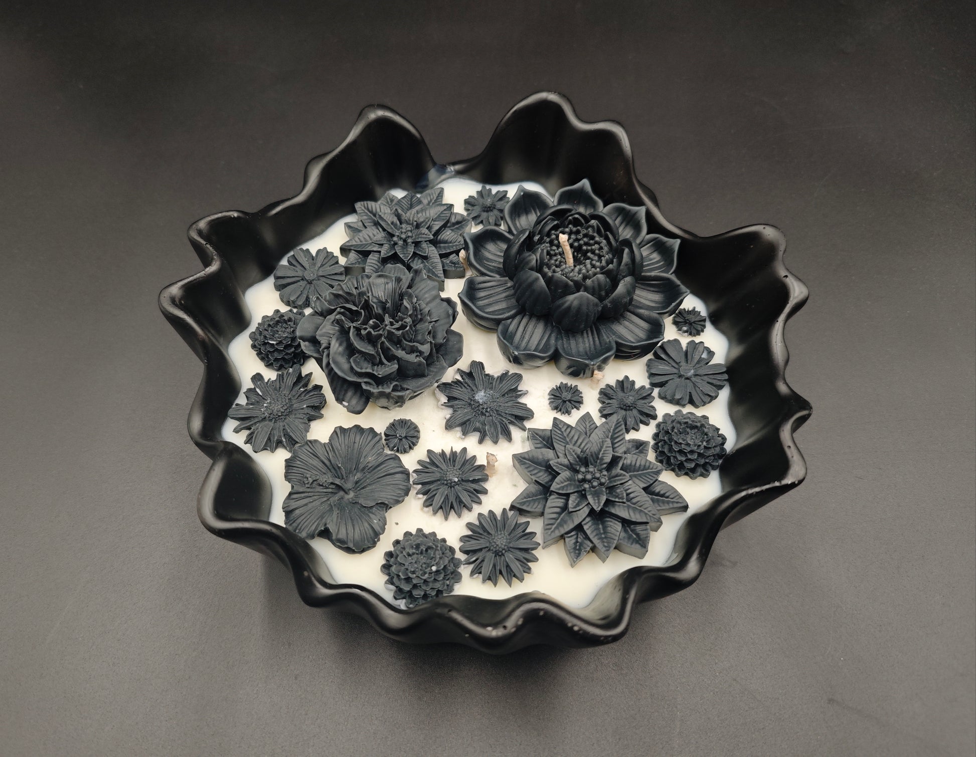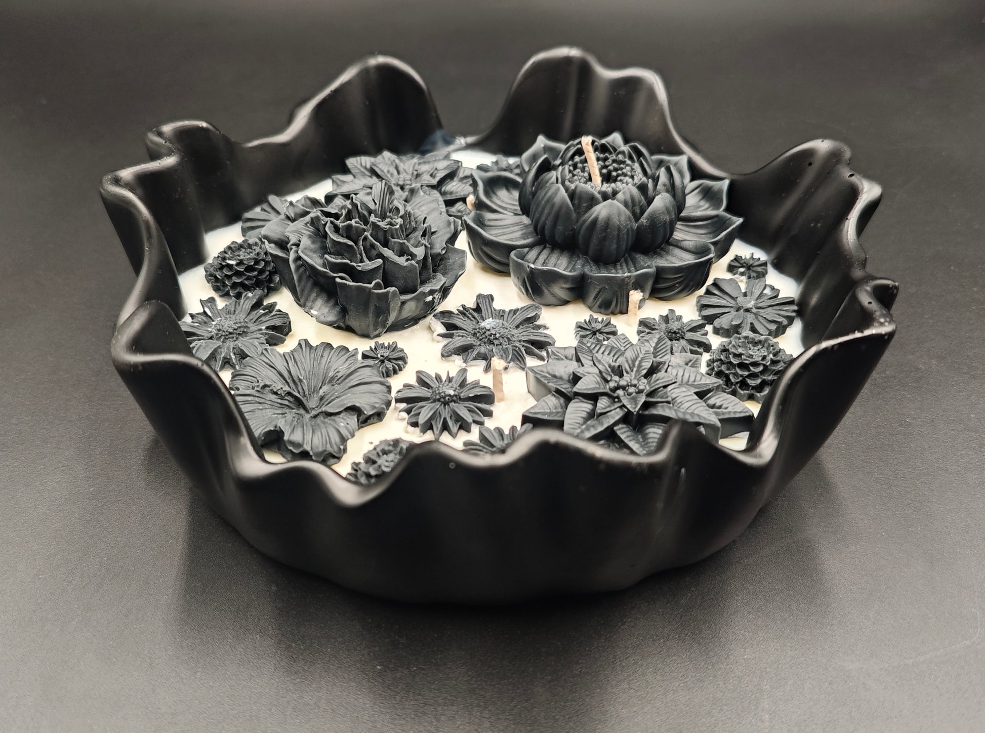 A Midnight Bloom a Black Elegance Kollekció egyik leglátványosabb, legművészibb kreációja. A hullámos peremű, fekete tál formájú gyertya olyan, mintha egy sötét tó felszíne tárulna elénk, amelyből aprólékosan megmintázott fekete virágok emelkednek ki – drámai, mégis finoman harmonikus kompozícióban.