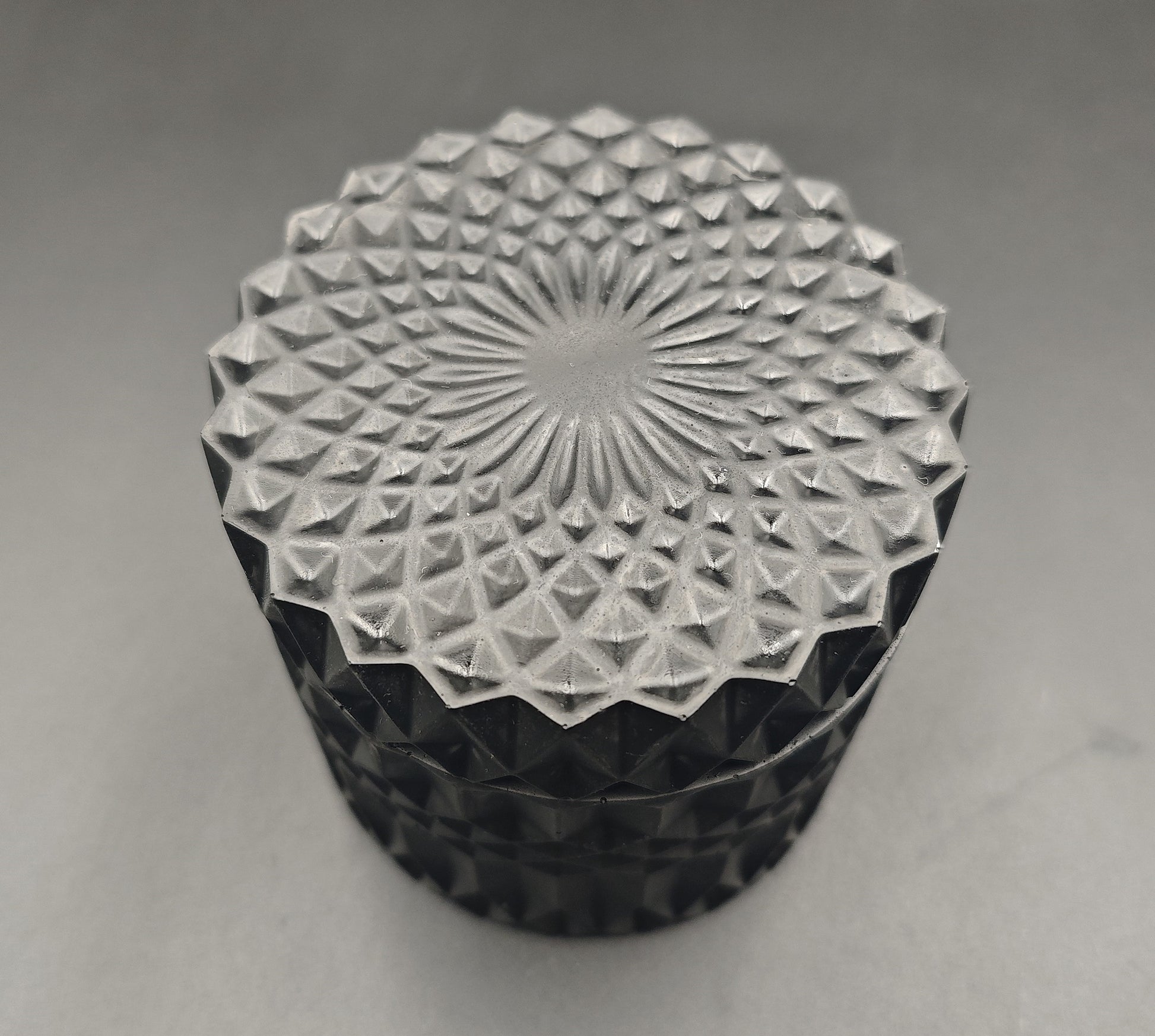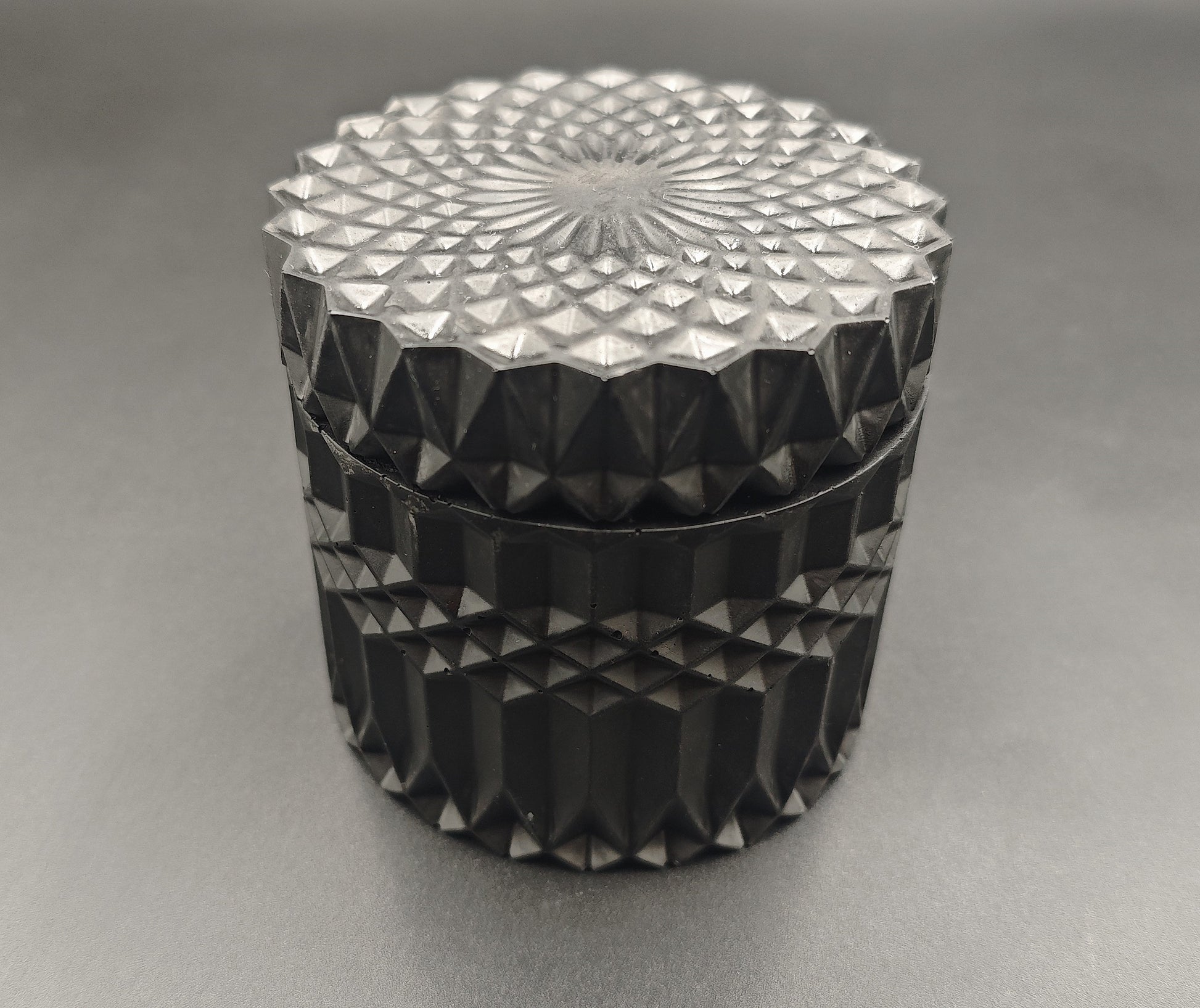A gyertya geometrikus mintázata a drágakövek fénytörését idézi — minden apró háromszög és él finoman játszik a fénnyel, mozgást és eleganciát adva ennek a különleges formának. Masszív, mégis kifinomult darab, amely a modern minimalizmust ötvözi a sötét luxus erőteljes esztétikájával.
