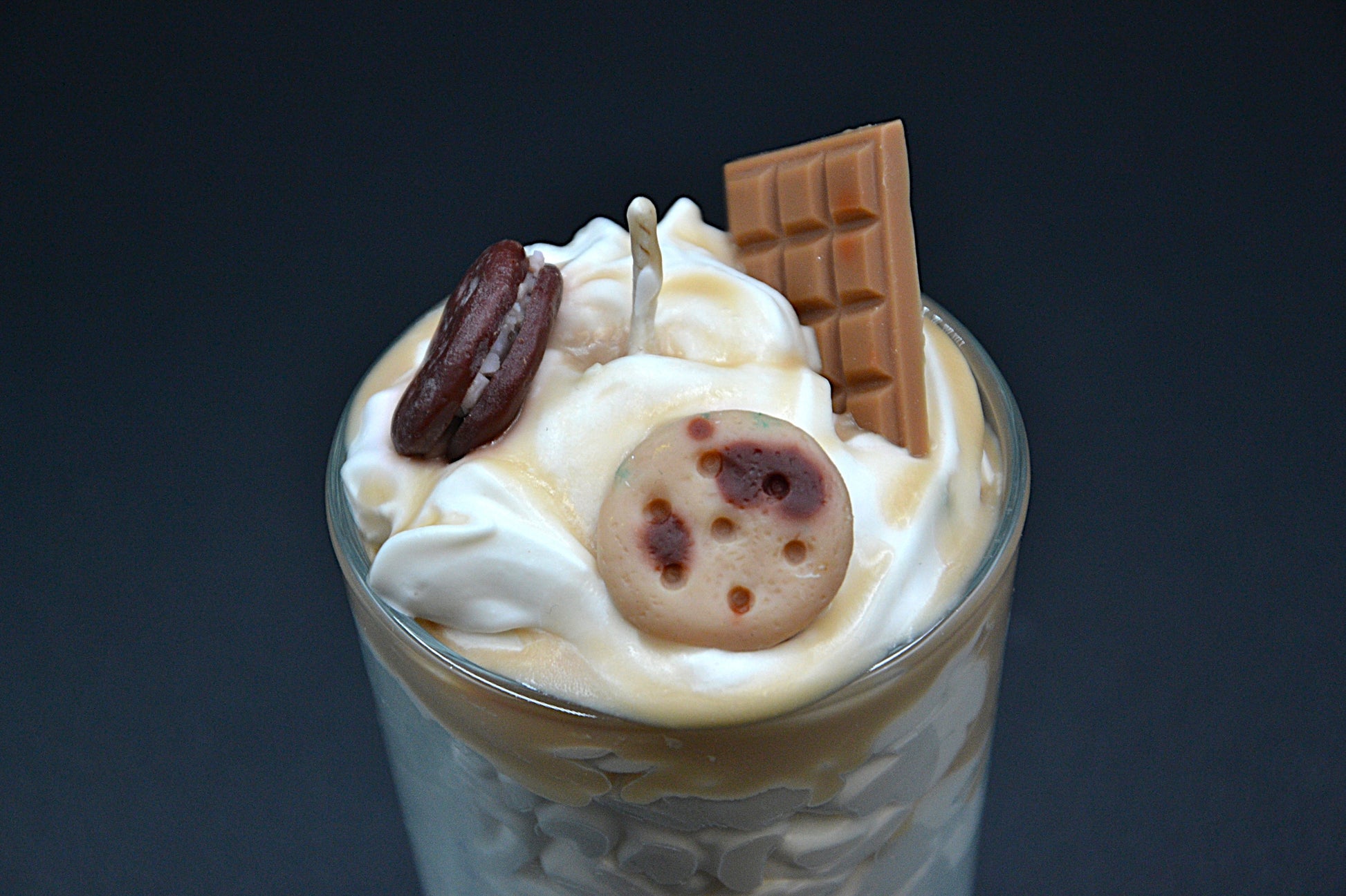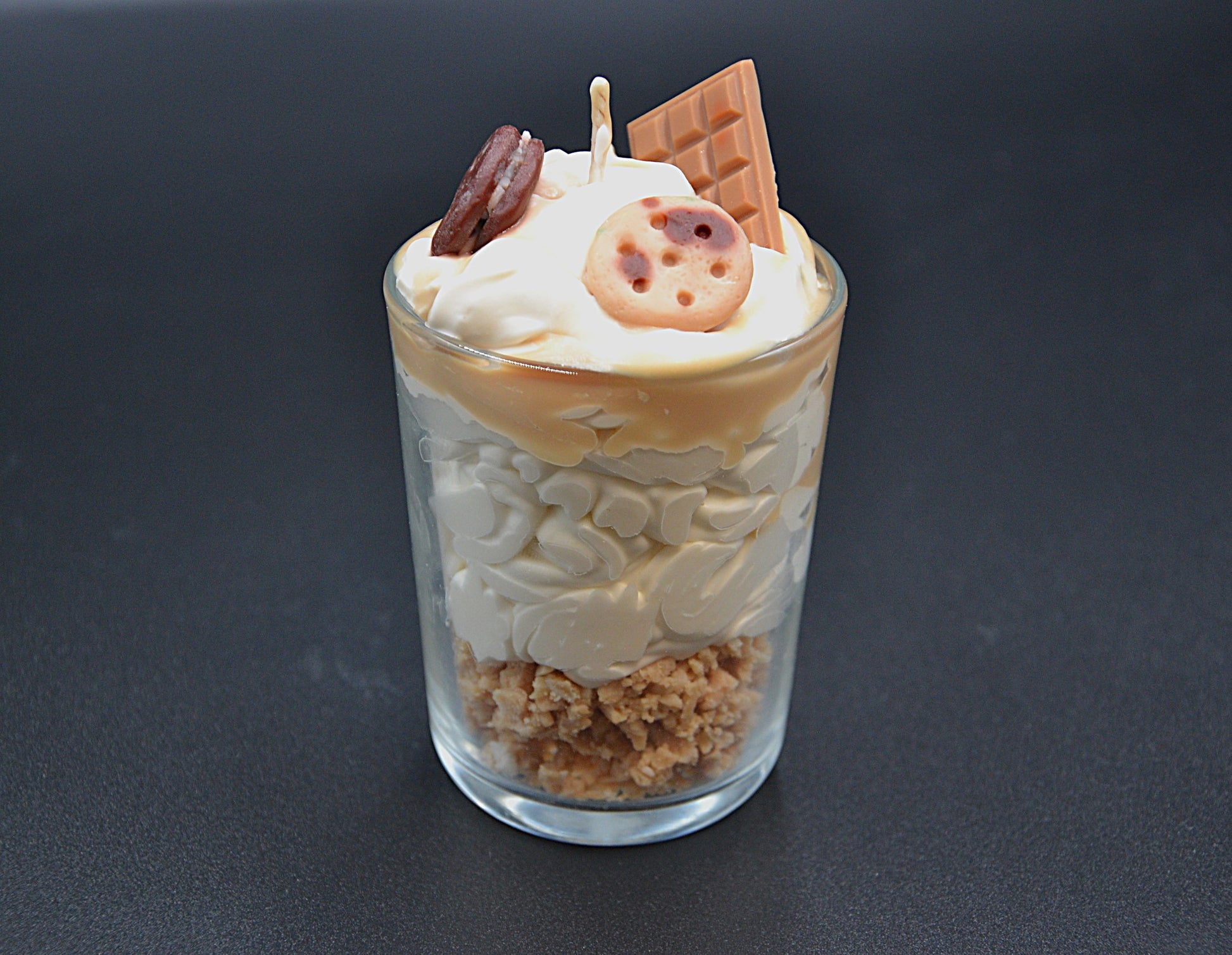 Kézzel készült, természetes szójaviasz gyertya édes, desszertszerű formában. A pohárban kekszes réteg, habos viaszkrém és apró díszek – csoki és keksz – idézik a frissen készült pohárdesszert hangulatát.