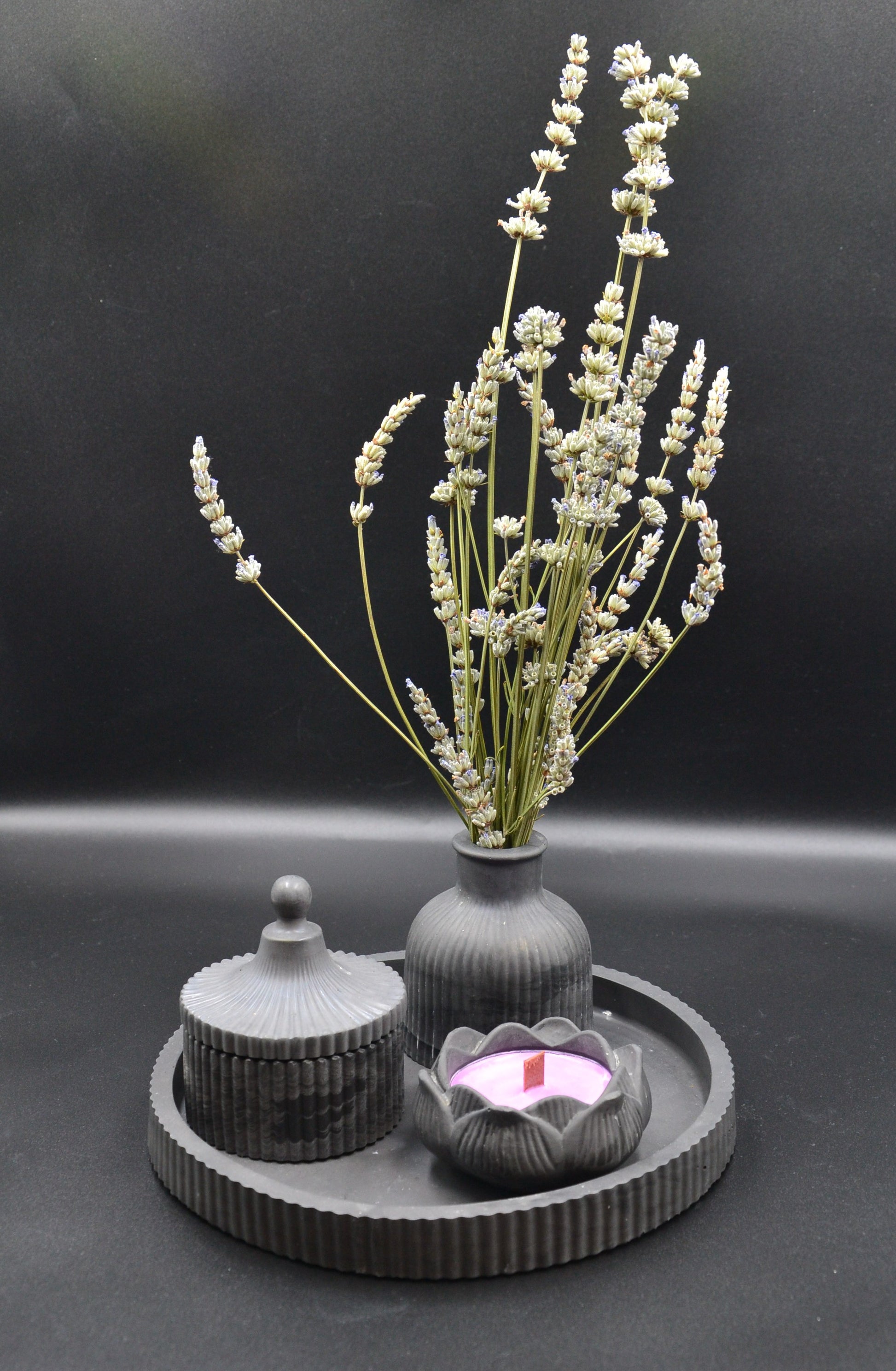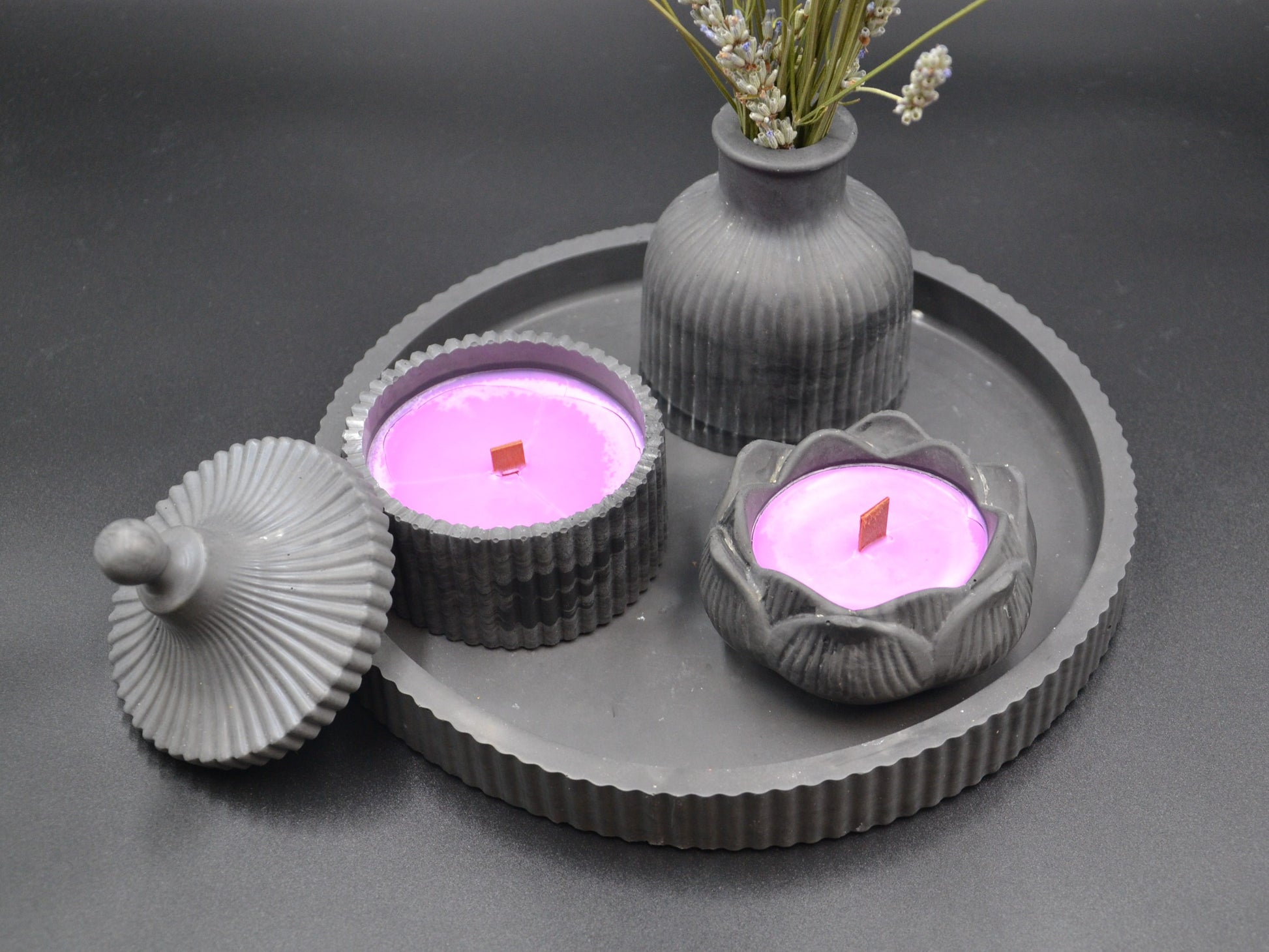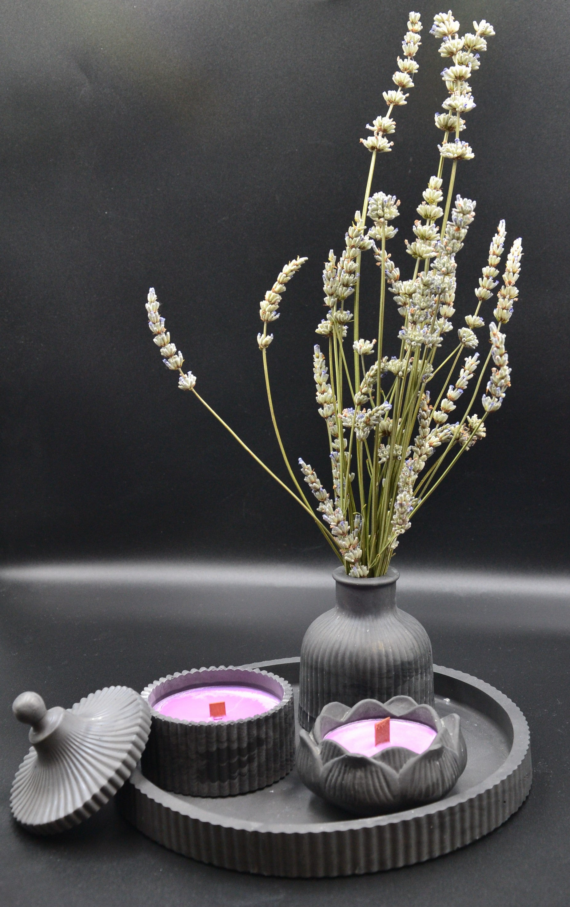 Kézzel készült, elegáns szett, amely két szójaviasz gyertyát, egy vázát és egy tálcát tartalmaz. Az ásványgyantából készült, matt sötétszürke elemek különleges textúrája modern, gótikus hangulatot áraszt.