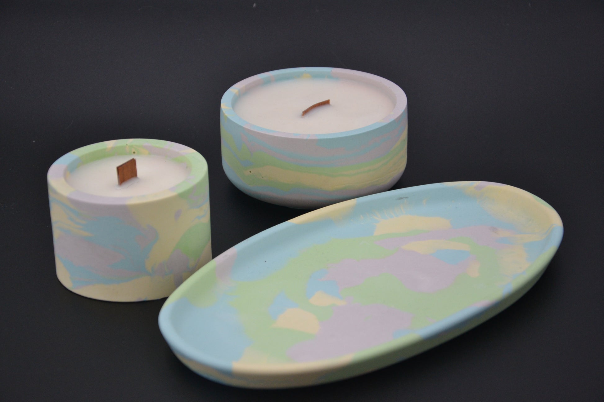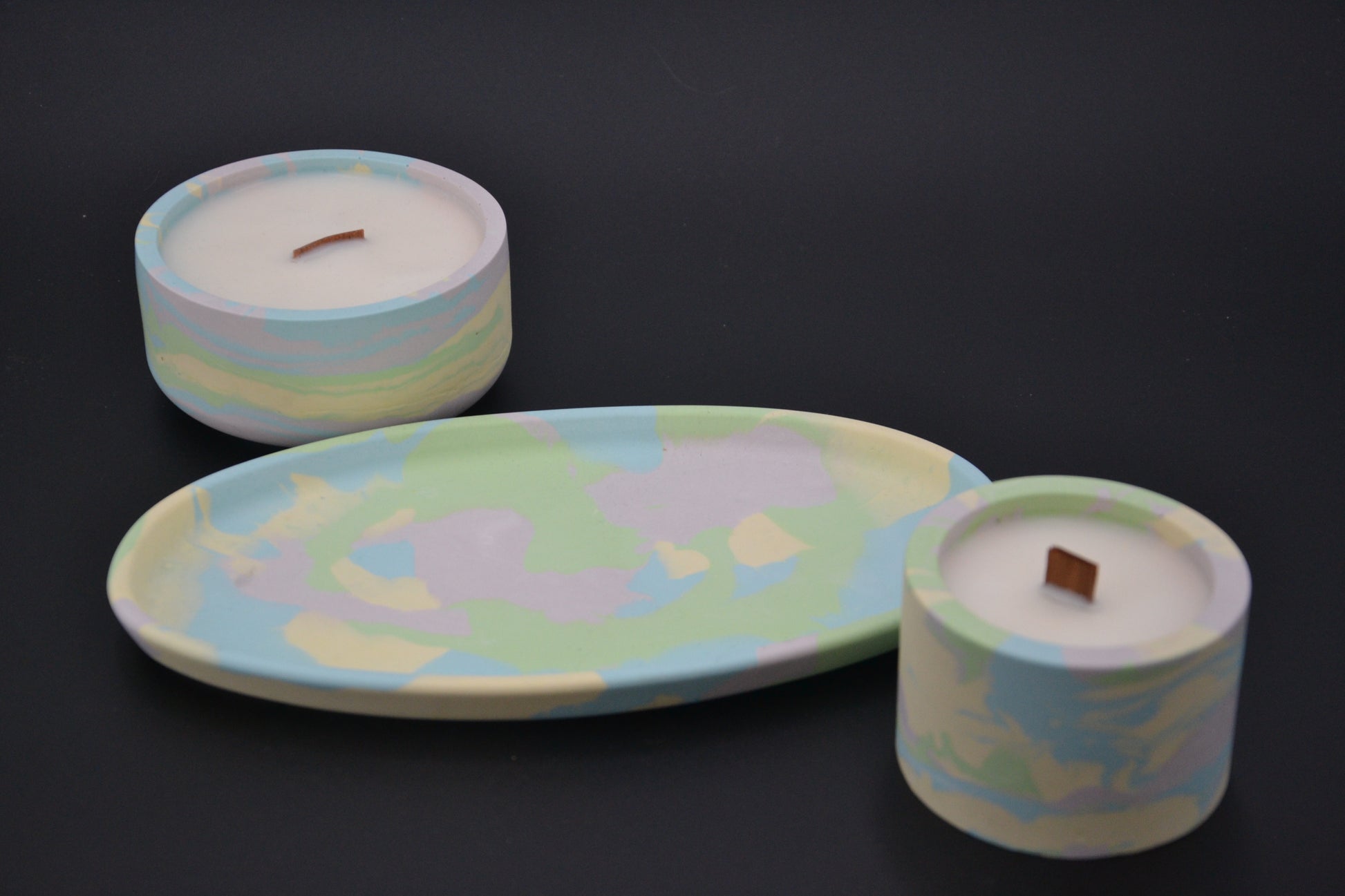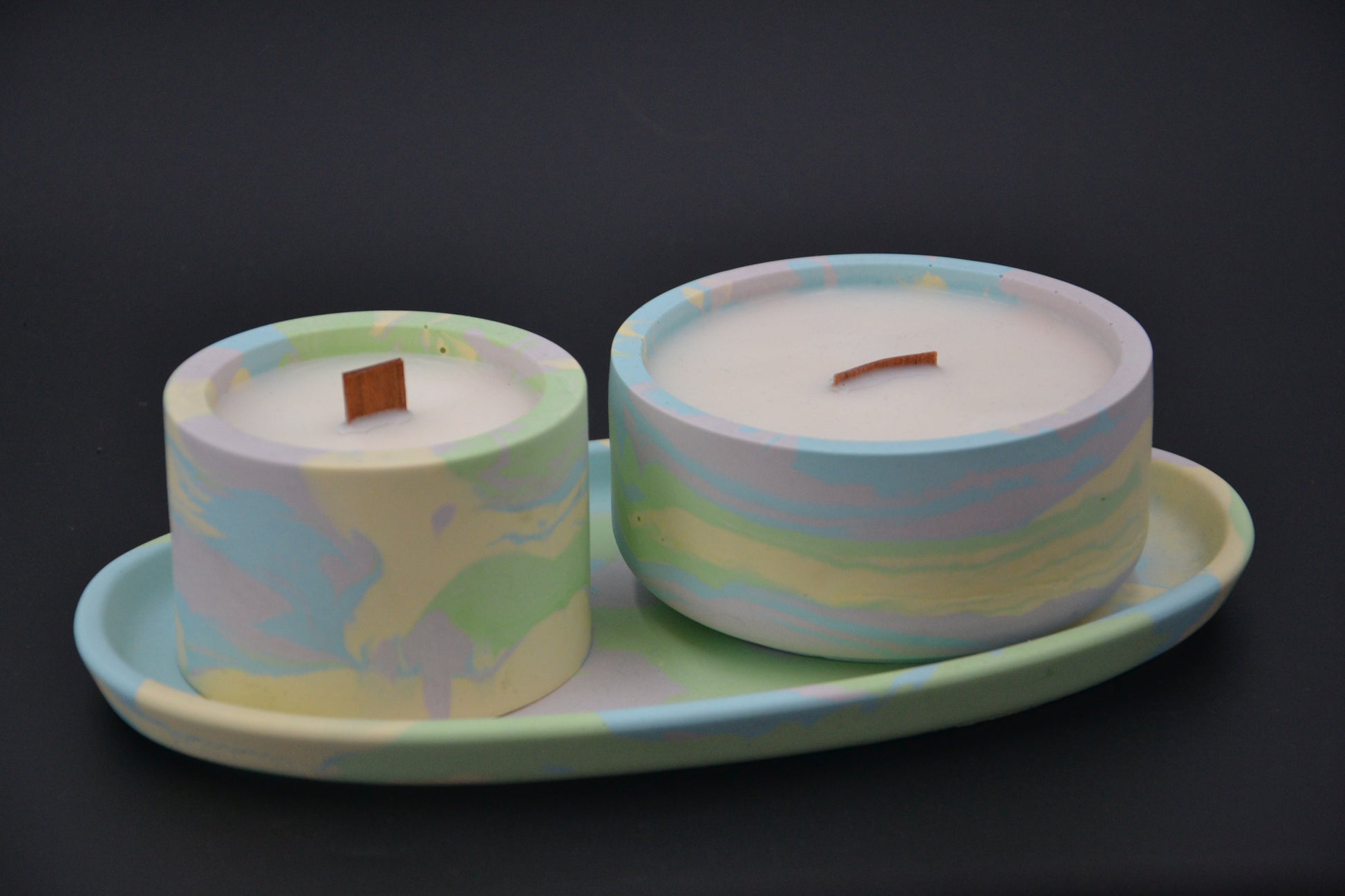 Ez az egyedi szett két kézzel öntött szójaviasz gyertyát tartalmaz, természetes fakanóccal, mely finoman pattogó hanggal idézi meg a kandalló melegét. A gyertyák elegáns márványmintás ásványgyanta tégelyekbe kerültek, melyeket egy színben harmonizáló ovális tálca egészít ki.