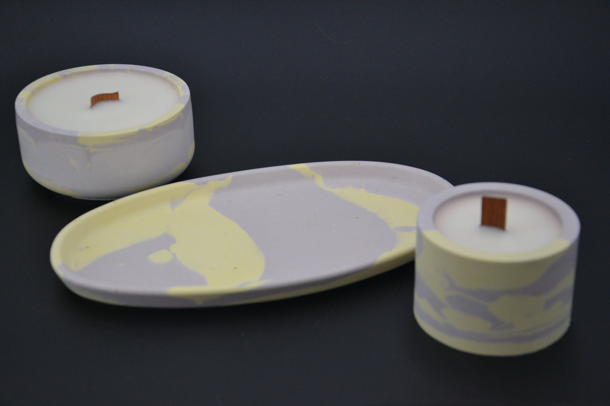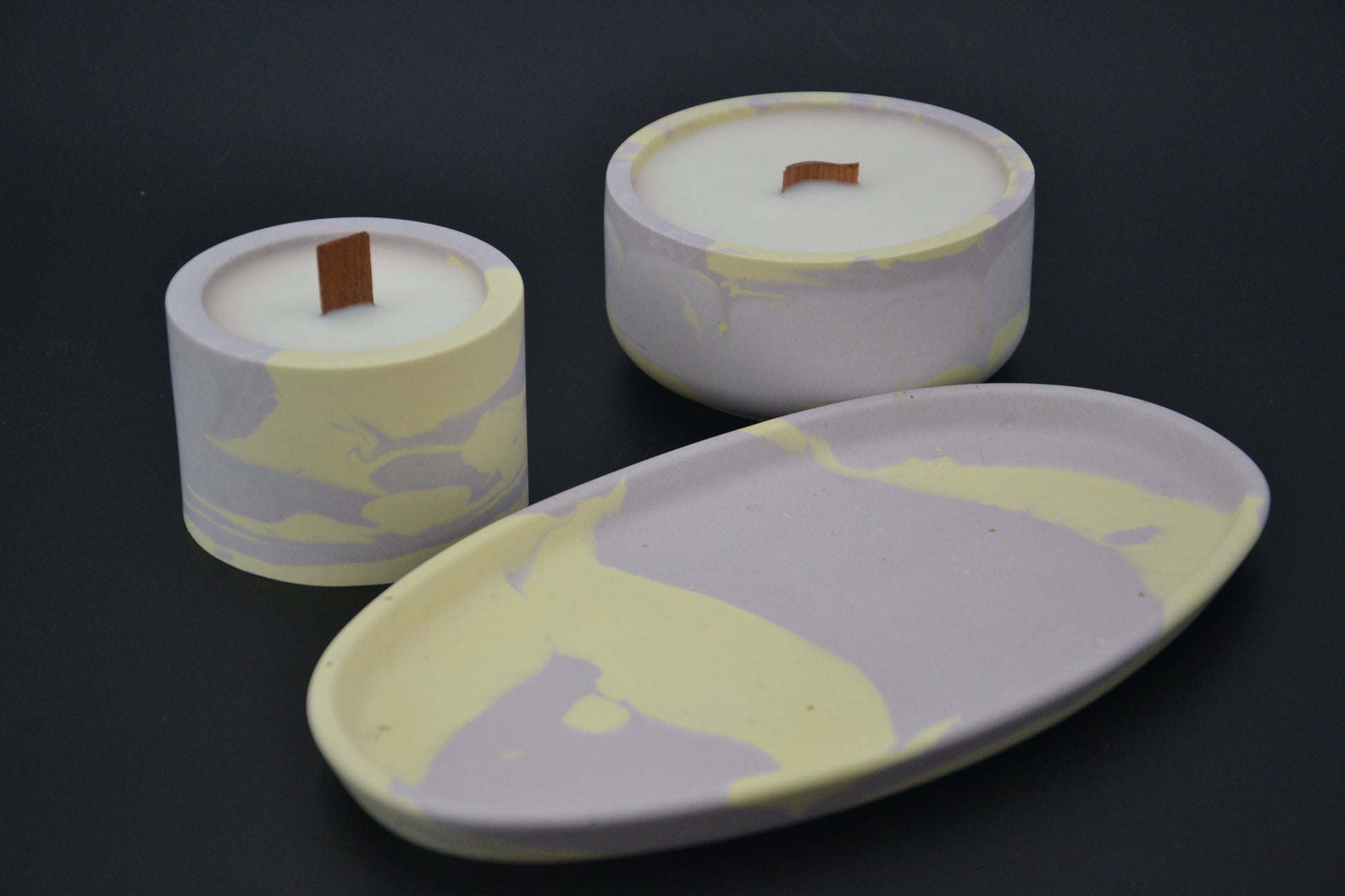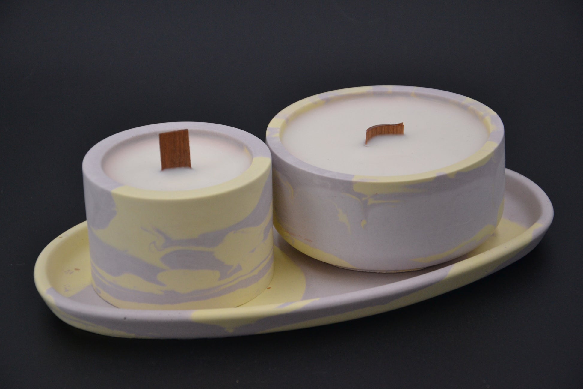Ez az egyedi szett két kézzel öntött szójaviasz gyertyát tartalmaz, természetes fakanóccal, mely finoman pattogó hanggal idézi meg a kandalló melegét. A gyertyák elegáns márványmintás ásványgyanta tégelyekbe kerültek, melyeket egy színben harmonizáló ovális tálca egészít ki.
