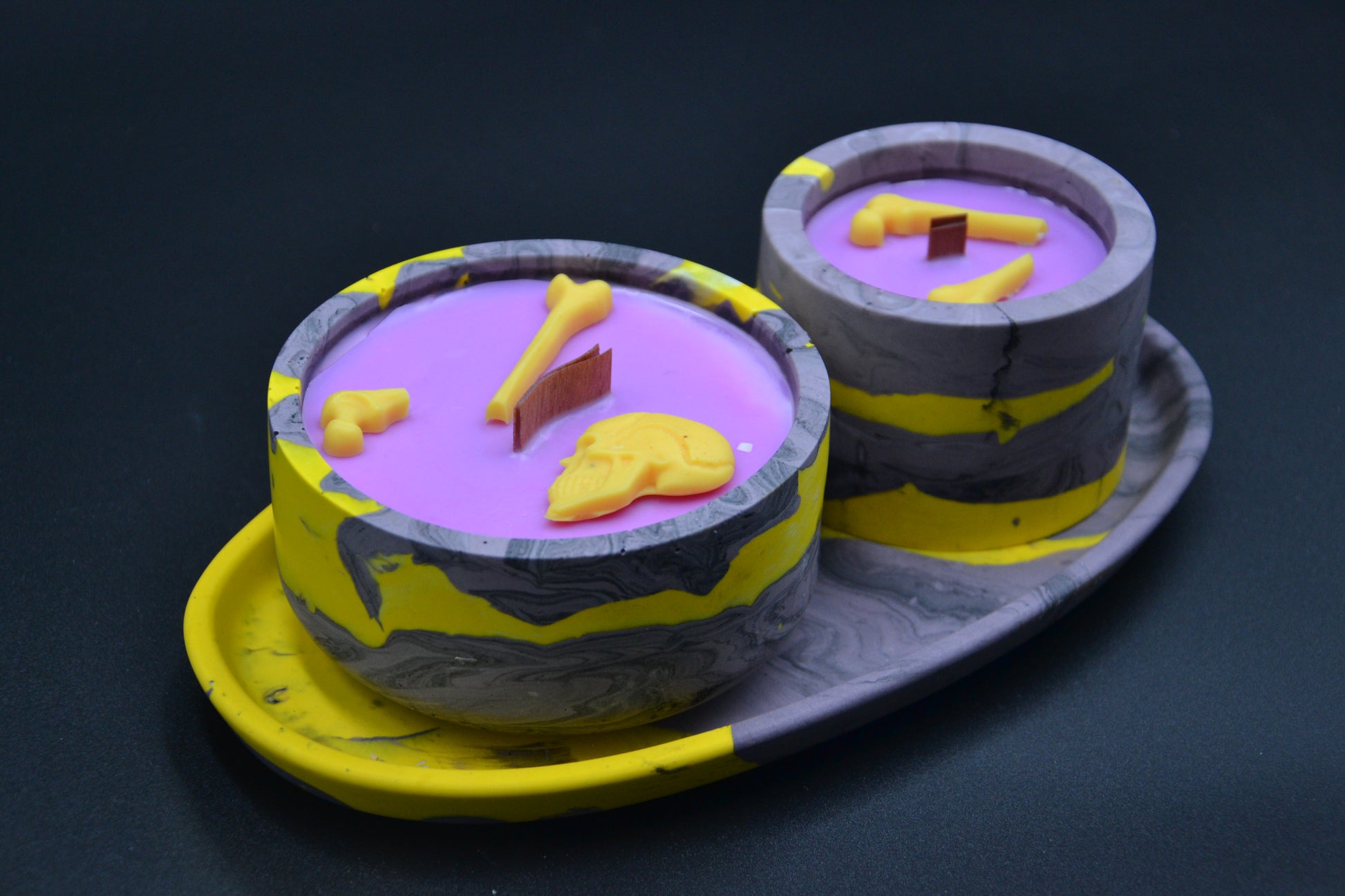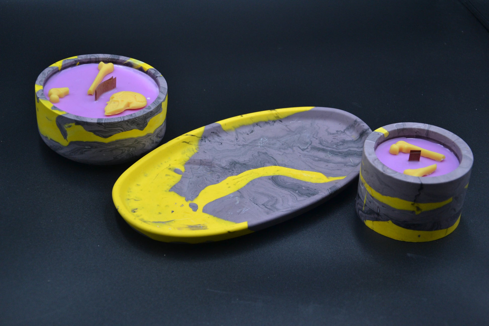 Ez az egyedi szett két kézzel öntött szójaviasz gyertyát tartalmaz, természetes fakanóccal, mely finoman pattogó hanggal idézi meg a kandalló melegét. A gyertyák elegáns márványmintás ásványgyanta tégelyekbe kerültek, melyeket egy színben harmonizáló ovális tálca egészít ki.