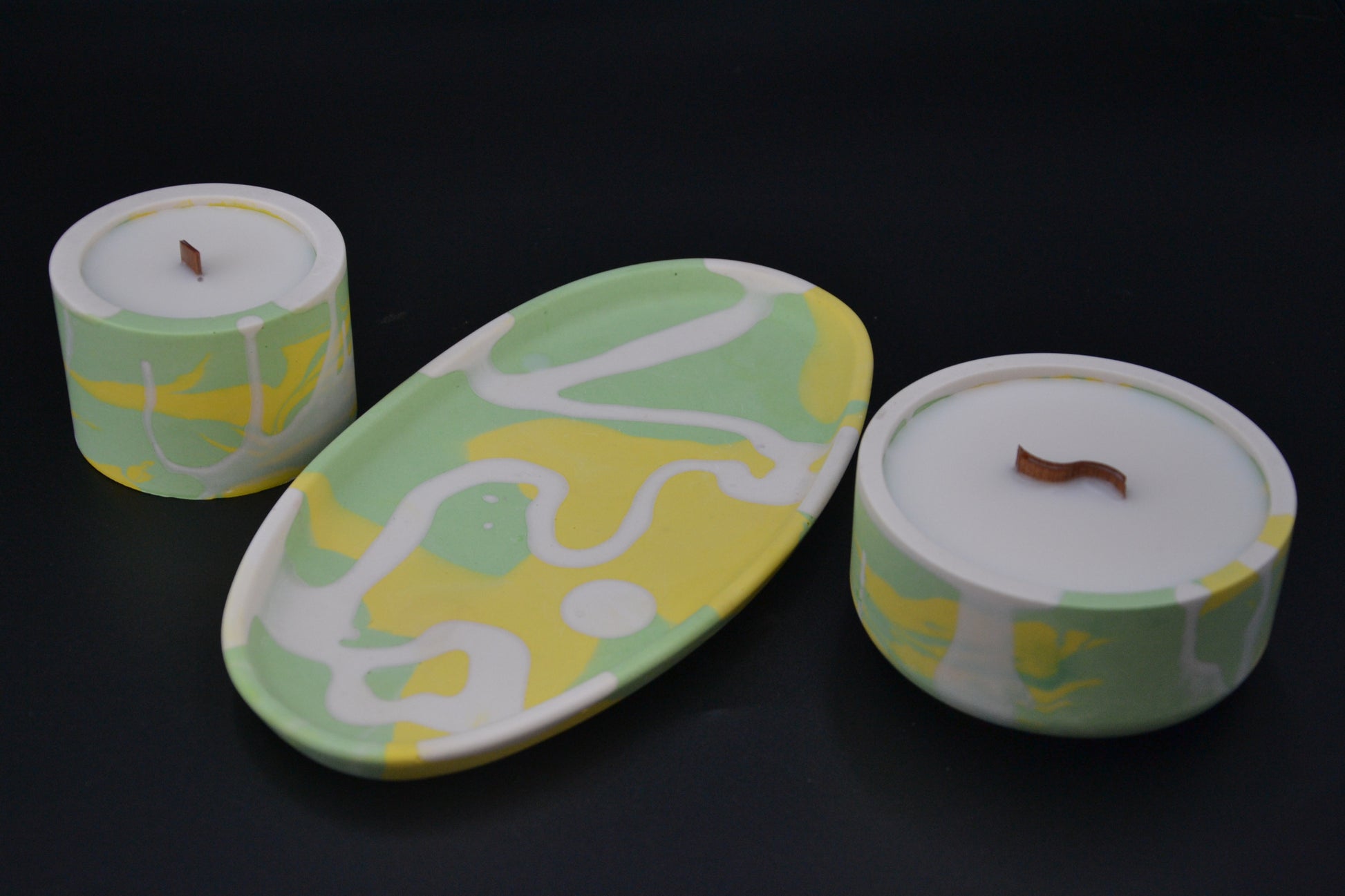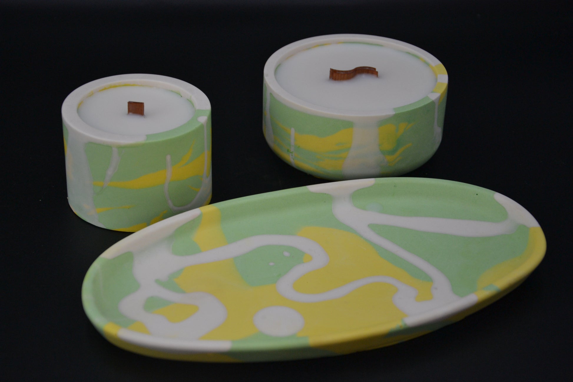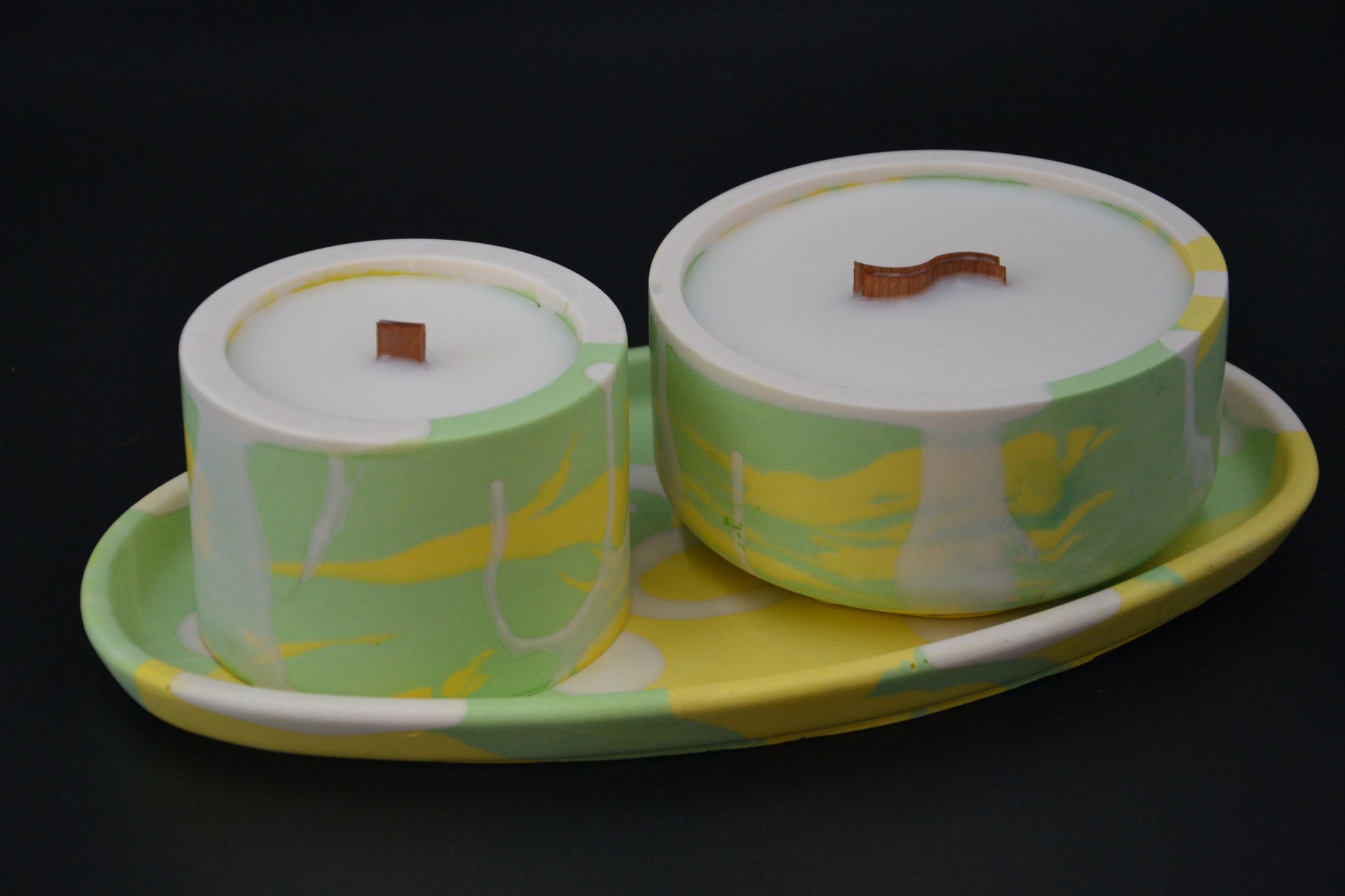 Ez az egyedi szett két kézzel öntött szójaviasz gyertyát tartalmaz, természetes fakanóccal, mely finoman pattogó hanggal idézi meg a kandalló melegét. A gyertyák elegáns márványmintás ásványgyanta tégelyekbe kerültek, melyeket egy színben harmonizáló ovális tálca egészít ki.