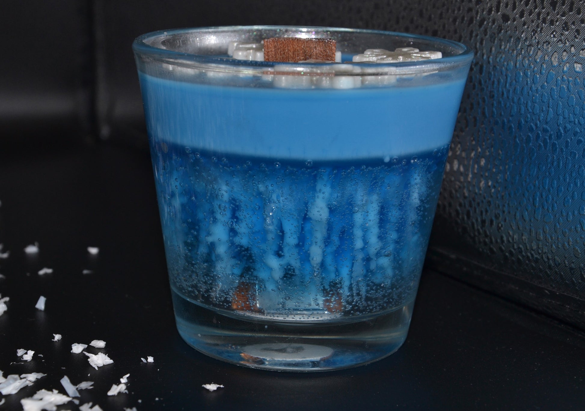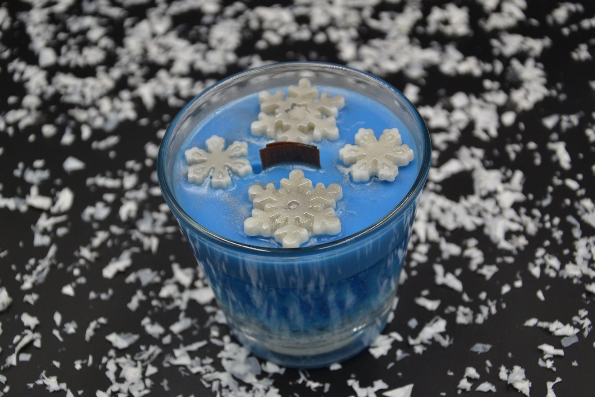 A Jégkristály egy különleges, téli hangulatú gyertya, amely a fagyos természet tisztaságát és a jégkristályok varázsát zárja magába. A mélykék és világoskék viaszrétegek gyönyörűen áttetszenek az üvegen, mintha egy fagyott tó mélységeibe pillantanánk. A tetején kézzel formált, ezüstösen csillogó hópelyhek ülnek, amelyeket a fa kanóc meleg fénye életre kelt.