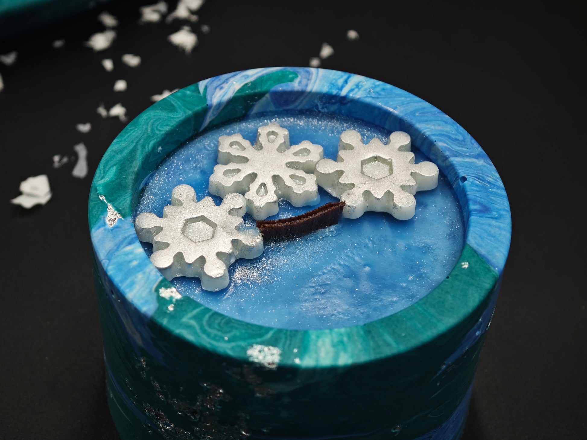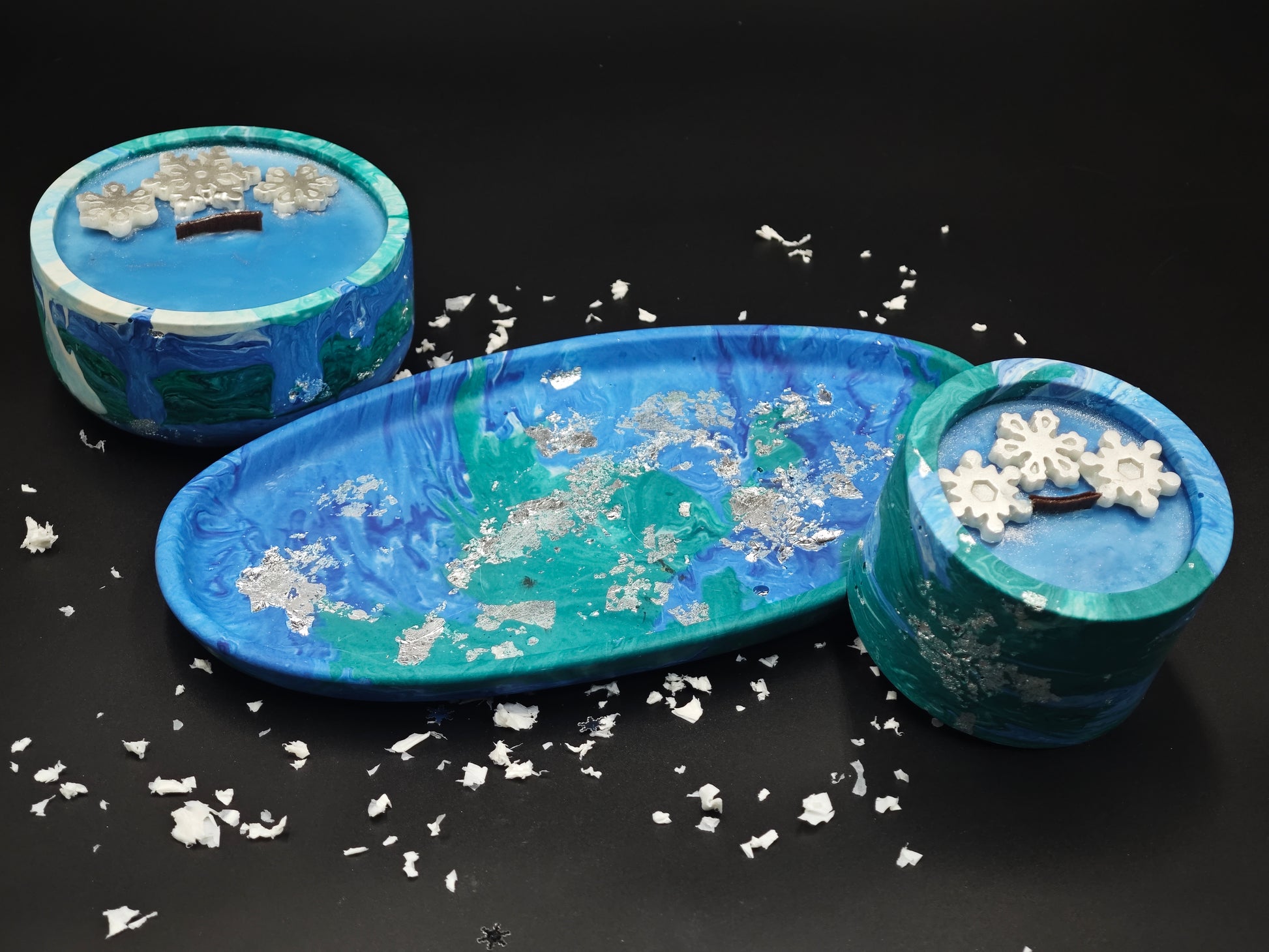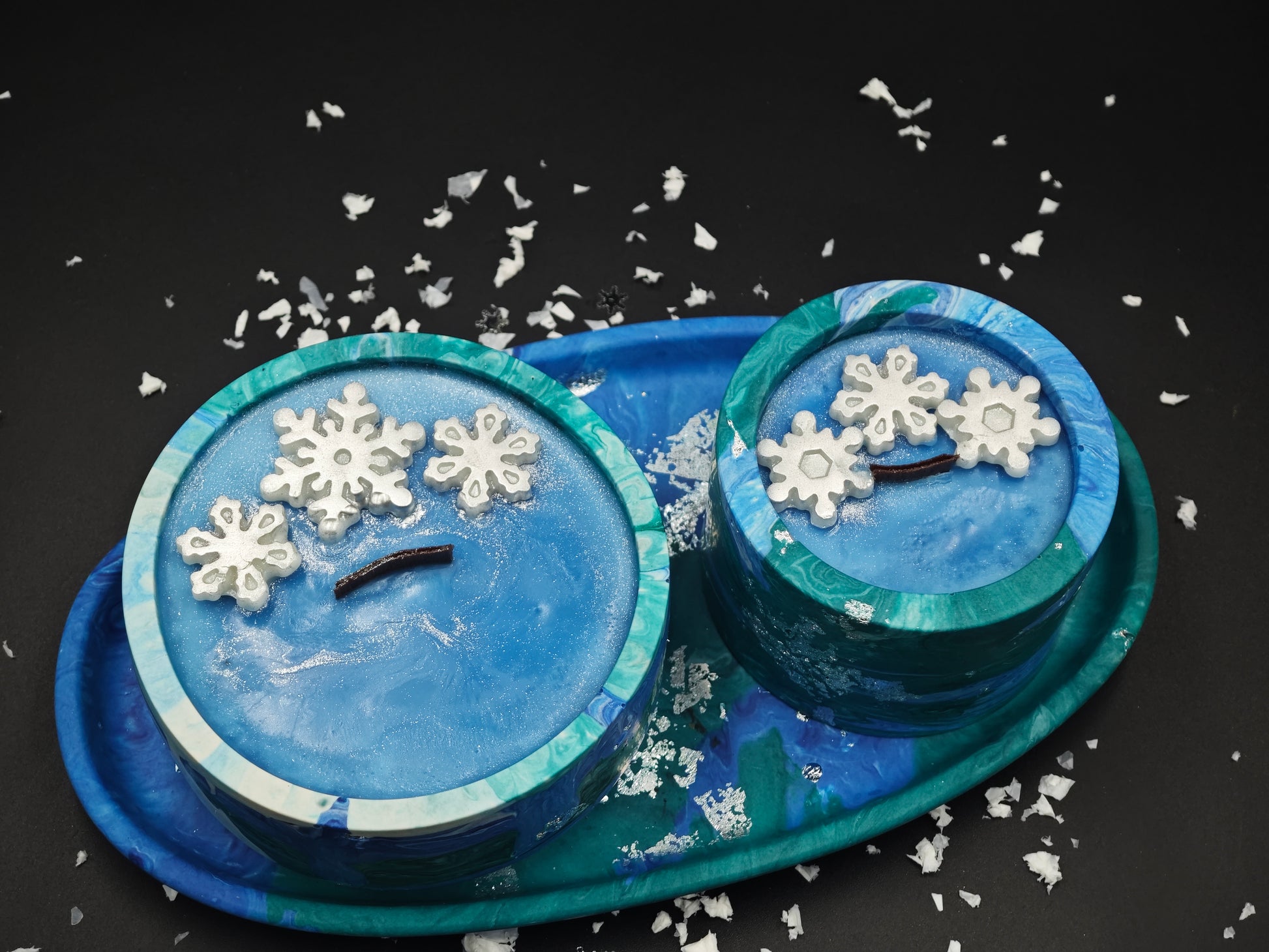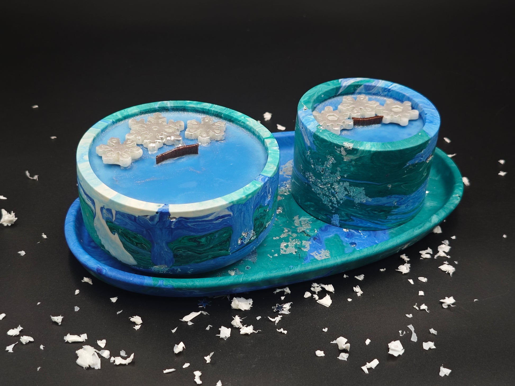 Ez az egyedi szett két kézzel öntött szójaviasz gyertyát tartalmaz, természetes fakanóccal, mely finoman pattogó hanggal idézi meg a kandalló melegét. A gyertyák elegáns márványmintás ásványgyanta tégelyekbe kerültek, melyeket egy színben harmonizáló ovális tálca egészít ki.