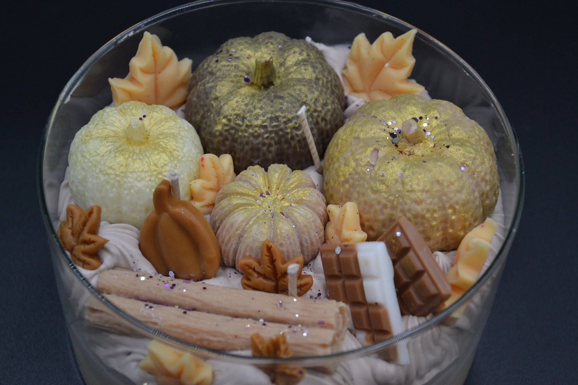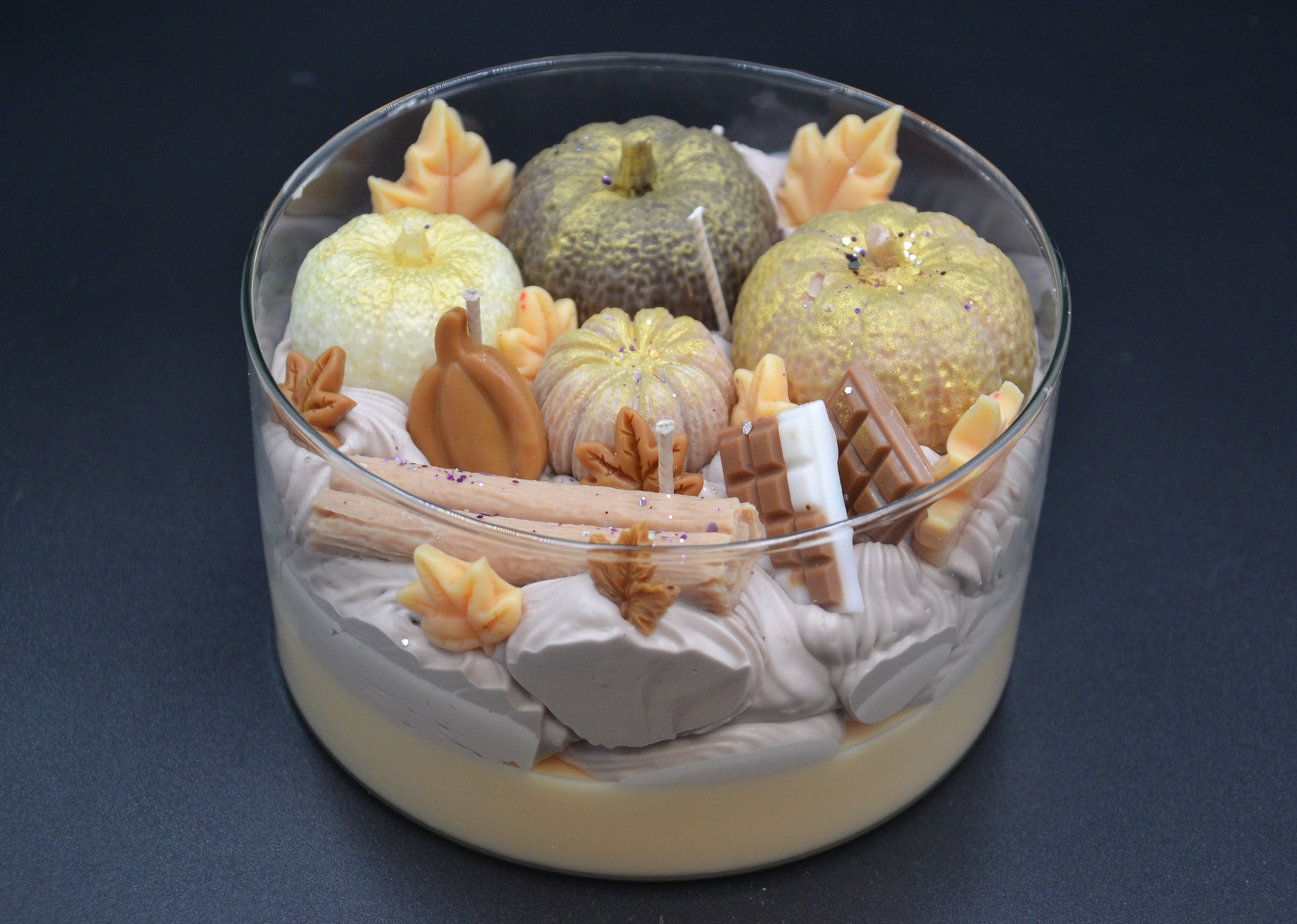 Kézzel készült, természetes szójaviasz gyertya átlátszó üvegtálban, apró tökökkel, levelekkel, csokoládéval és fahéjrúddal díszítve. Meleg sütőtök–fahéj–vanília illata betölti a teret, és meghitt, otthonos őszi hangulatot teremt.
