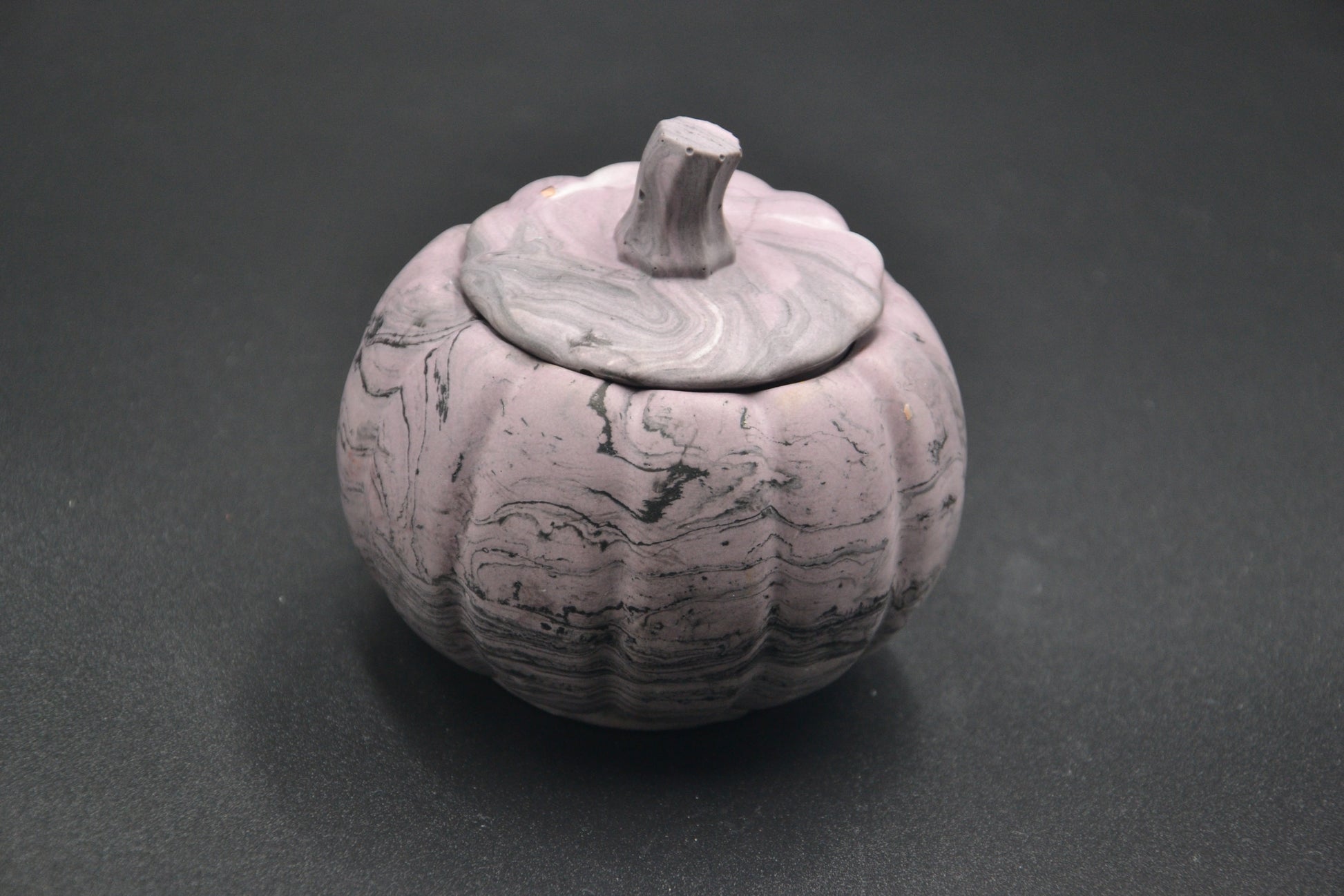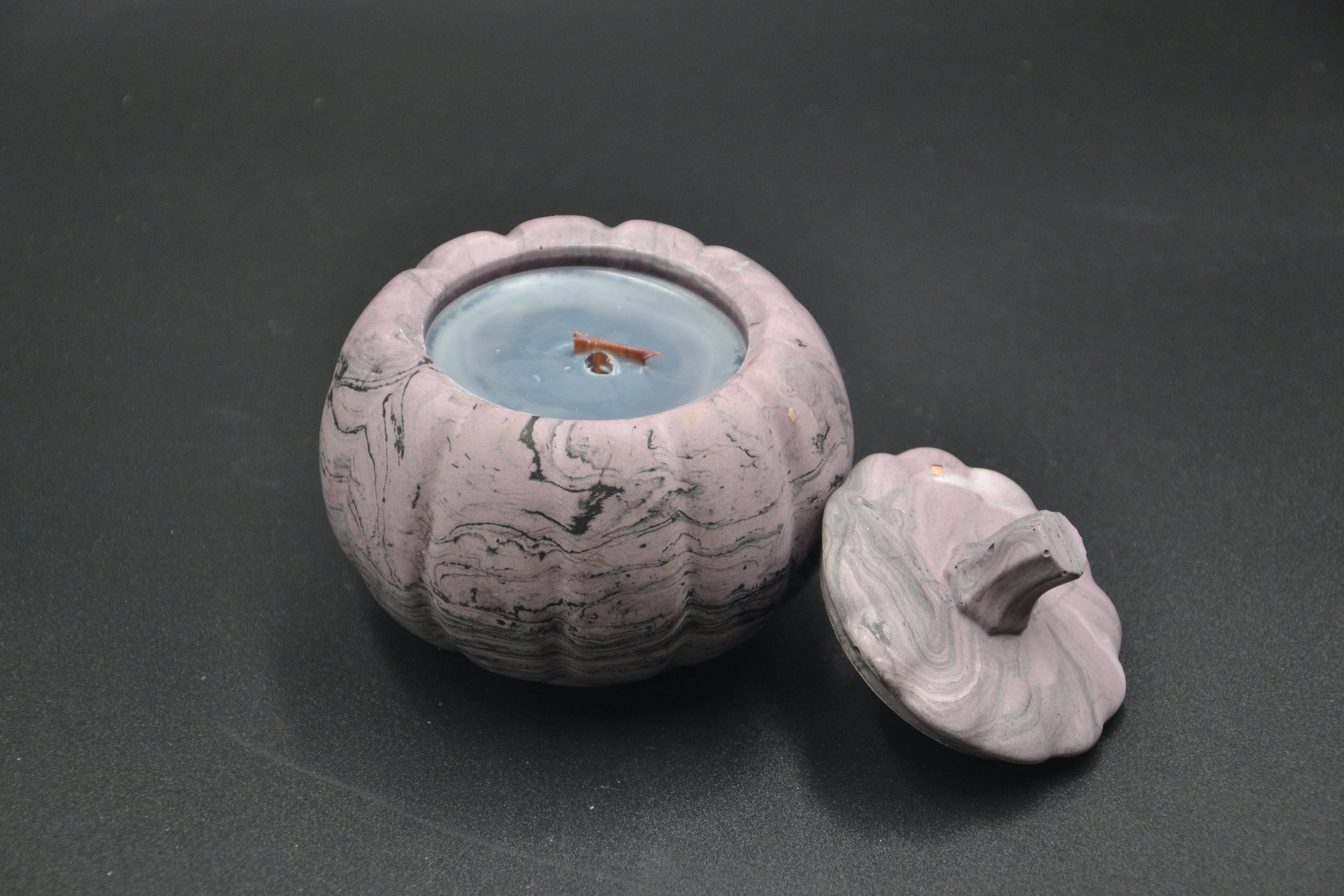 Kézzel készült, egyedi tök alakú gyertya természetes szójaviaszból, ásványgyanta tartóban. A márványos mintázat minden darabot különlegessé tesz, így igazi őszi dísze lehet bármely otthonnak.