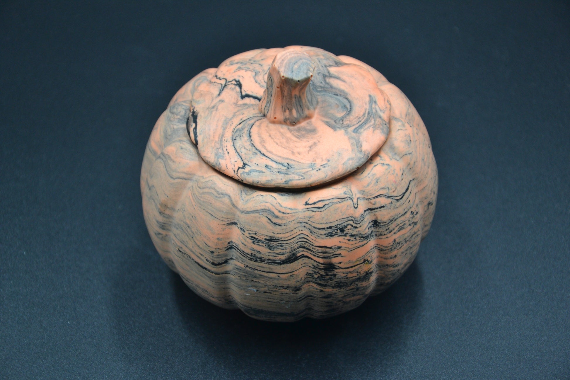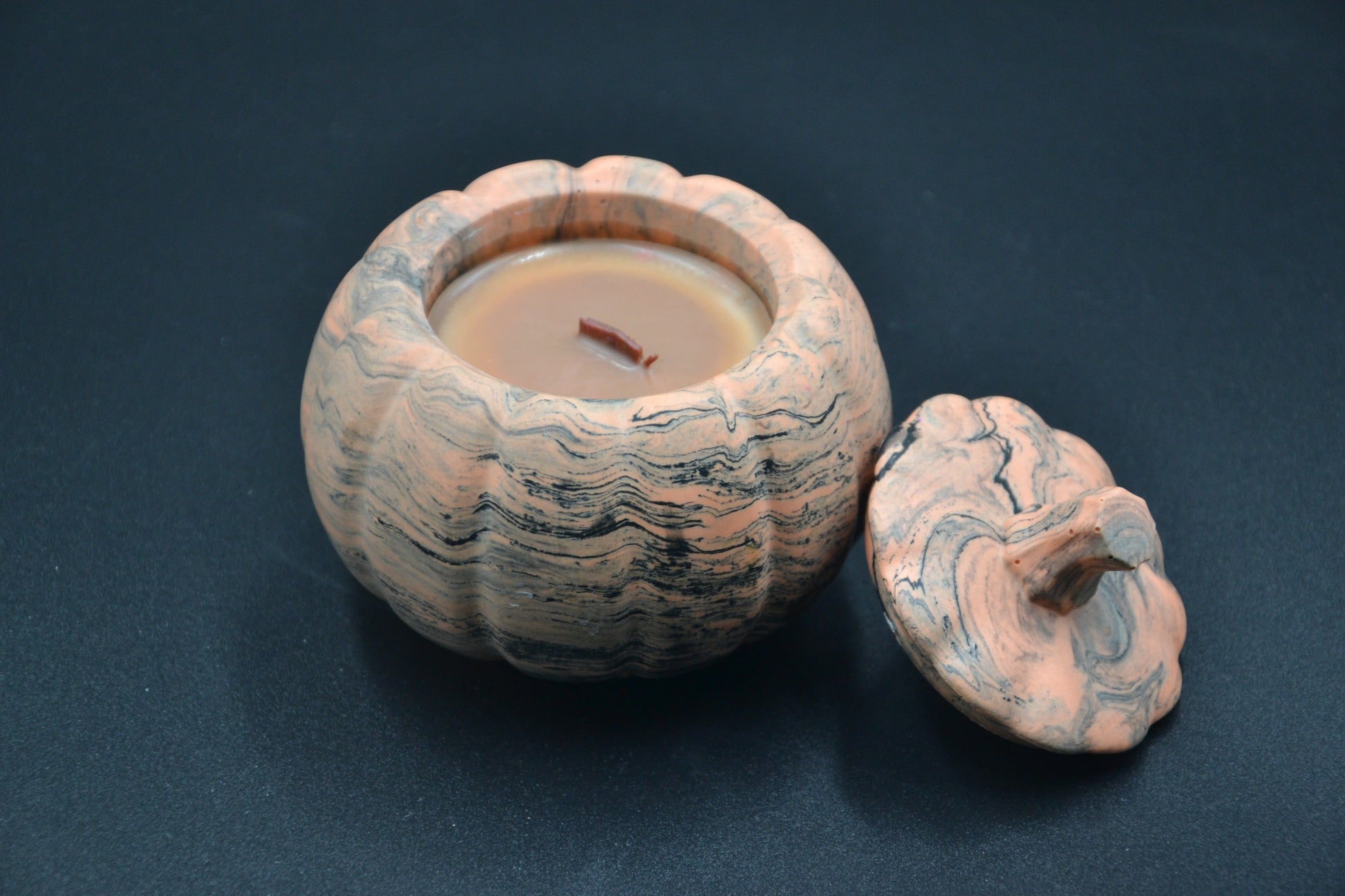 Kézzel készült, egyedi tök alakú gyertya természetes szójaviaszból, ásványgyanta tartóban. A márványos mintázat minden darabot különlegessé tesz, így igazi őszi dísze lehet bármely otthonnak.