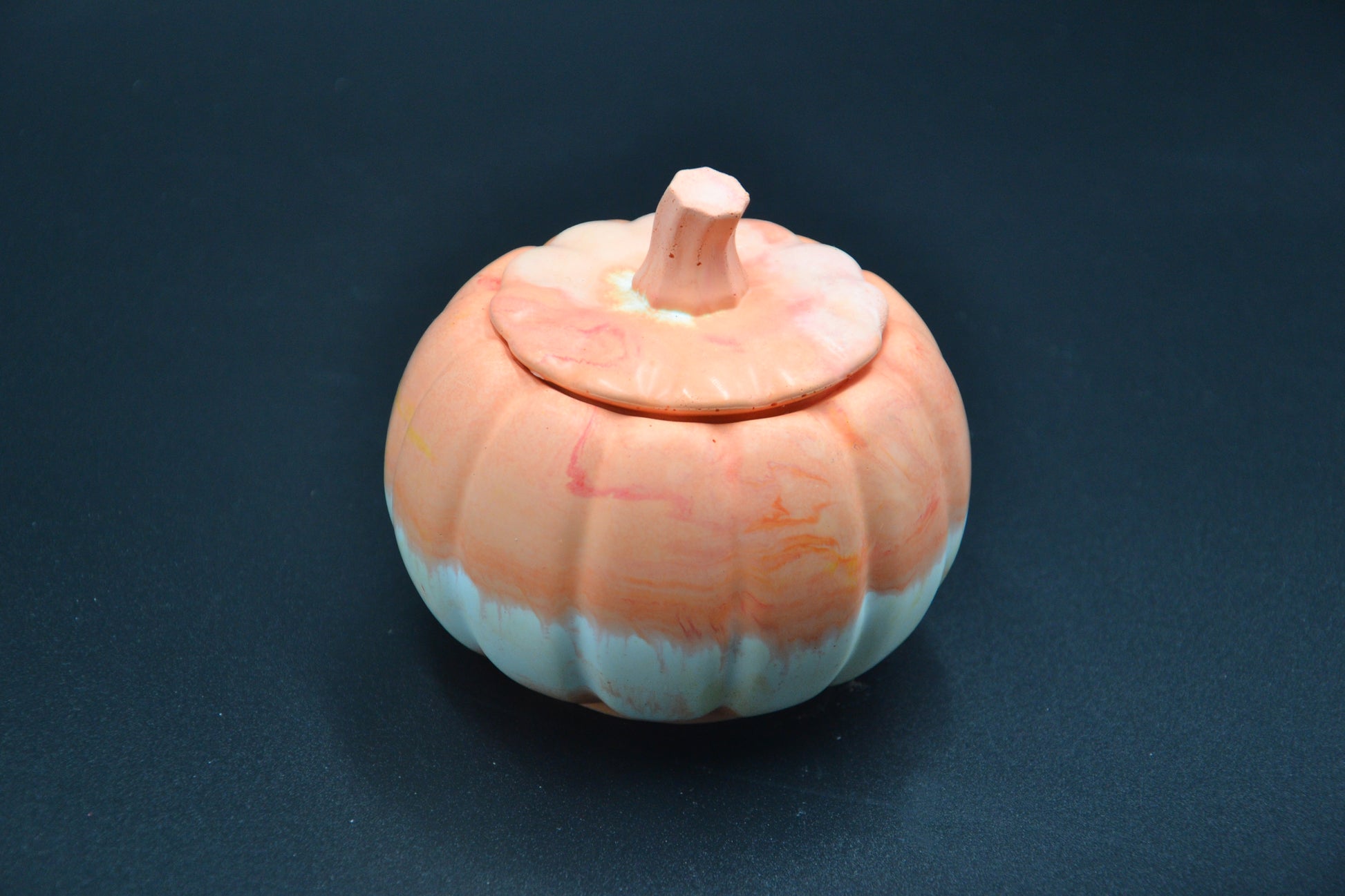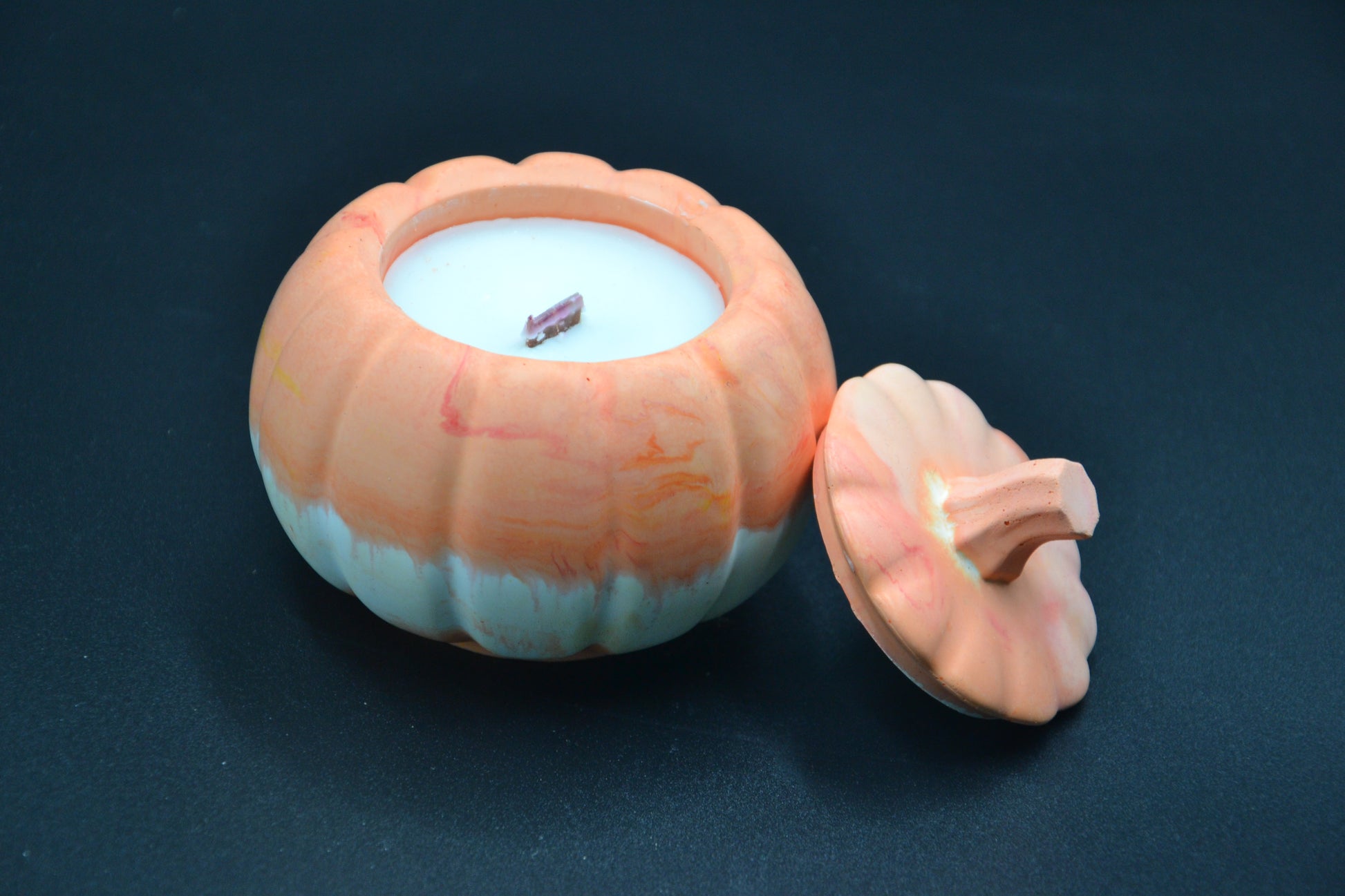 Kézzel készült, egyedi tök alakú gyertya természetes szójaviaszból, ásványgyanta tartóban. A márványos mintázat minden darabot különlegessé tesz, így igazi őszi dísze lehet bármely otthonnak.