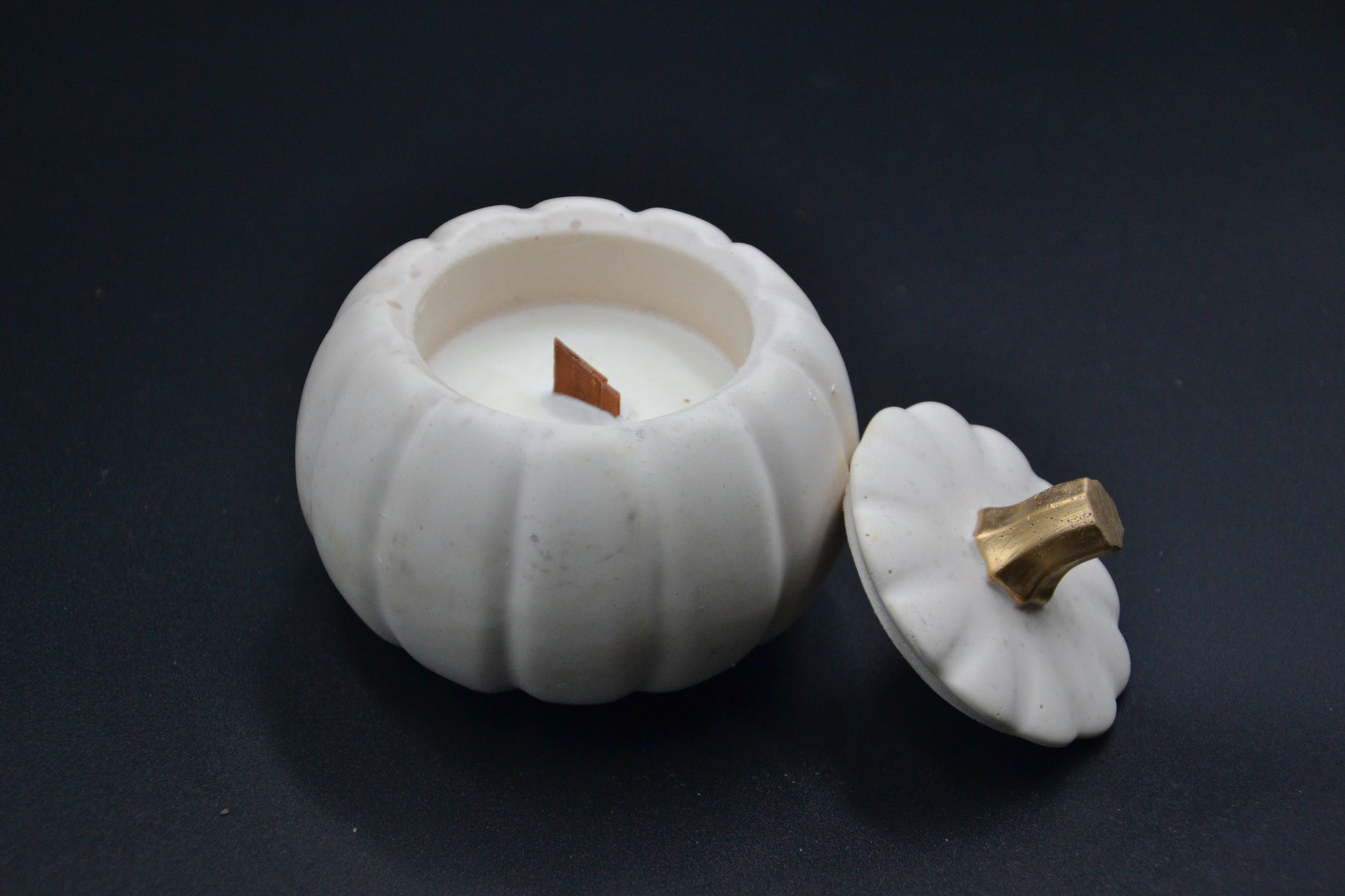 Kézzel készült, egyedi tök alakú gyertya természetes szójaviaszból, ásványgyanta tartóban. A márványos mintázat minden darabot különlegessé tesz, így igazi őszi dísze lehet bármely otthonnak.