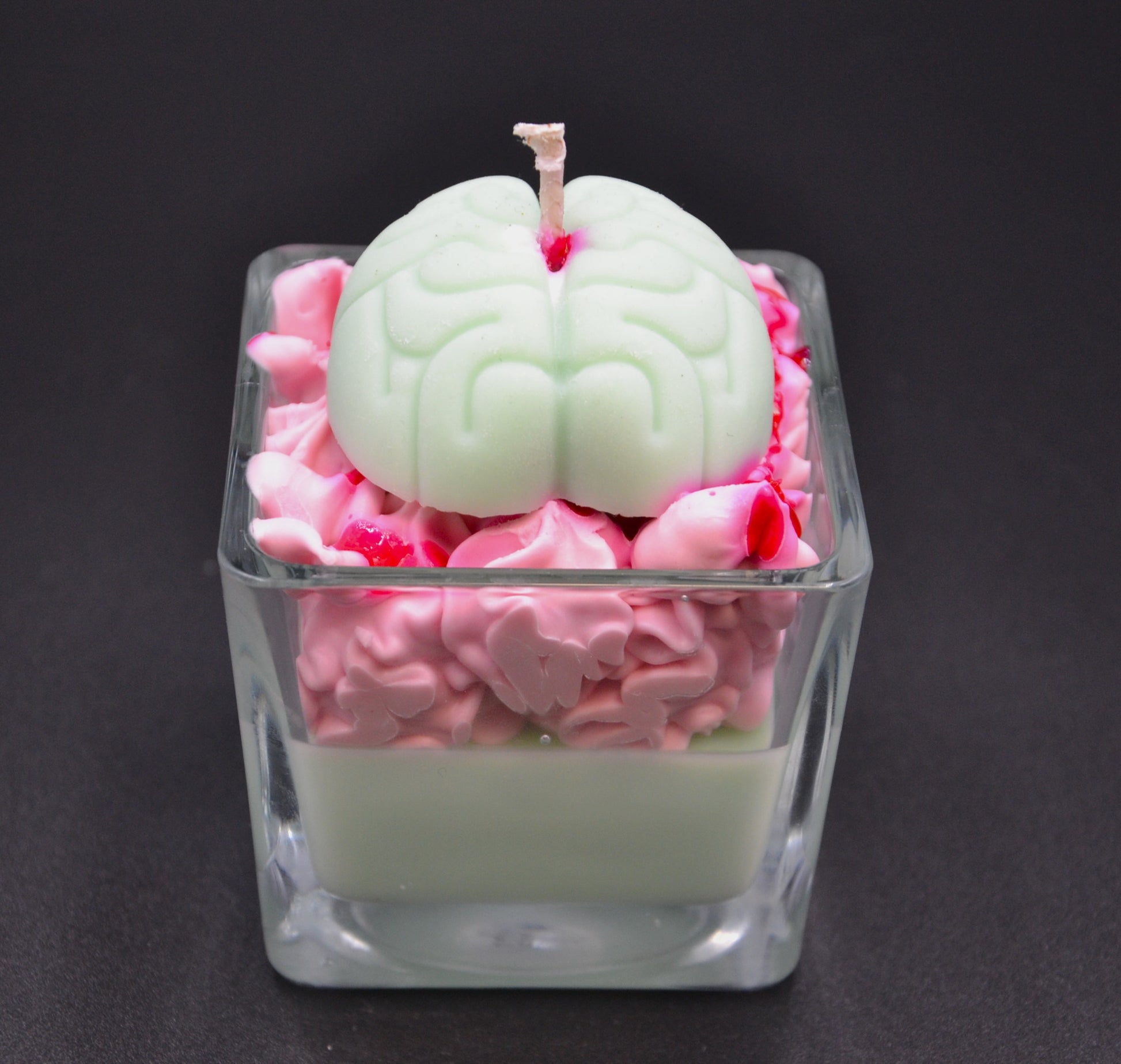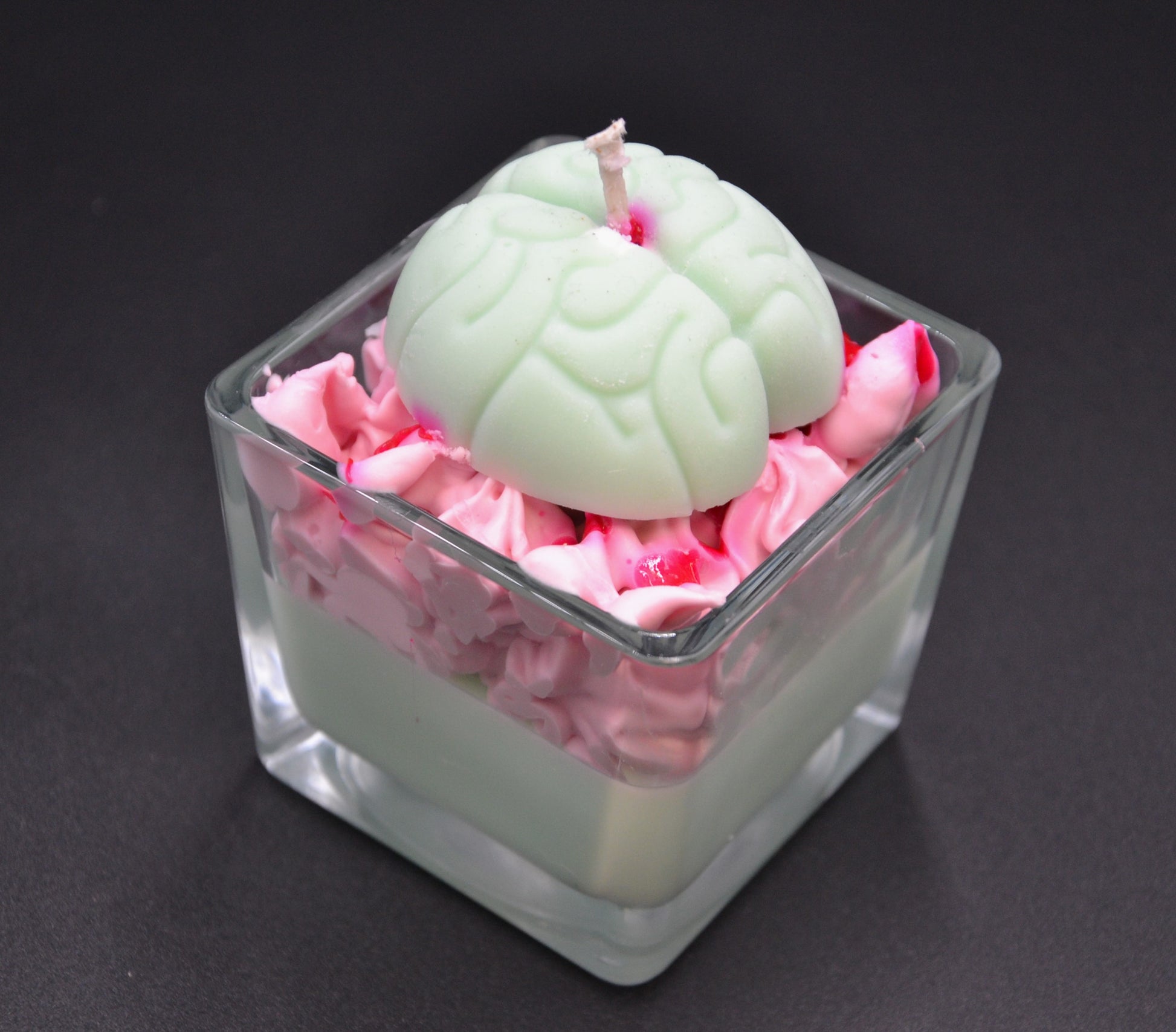 Kézzel készült, természetes szójaviasz gyertya különleges „zombiagy” díszítéssel. A halványzöld agy és a vérvörös habos alap egyedi, halloween hangulatot idéz.